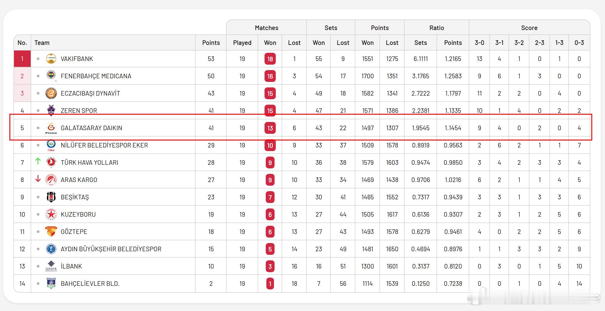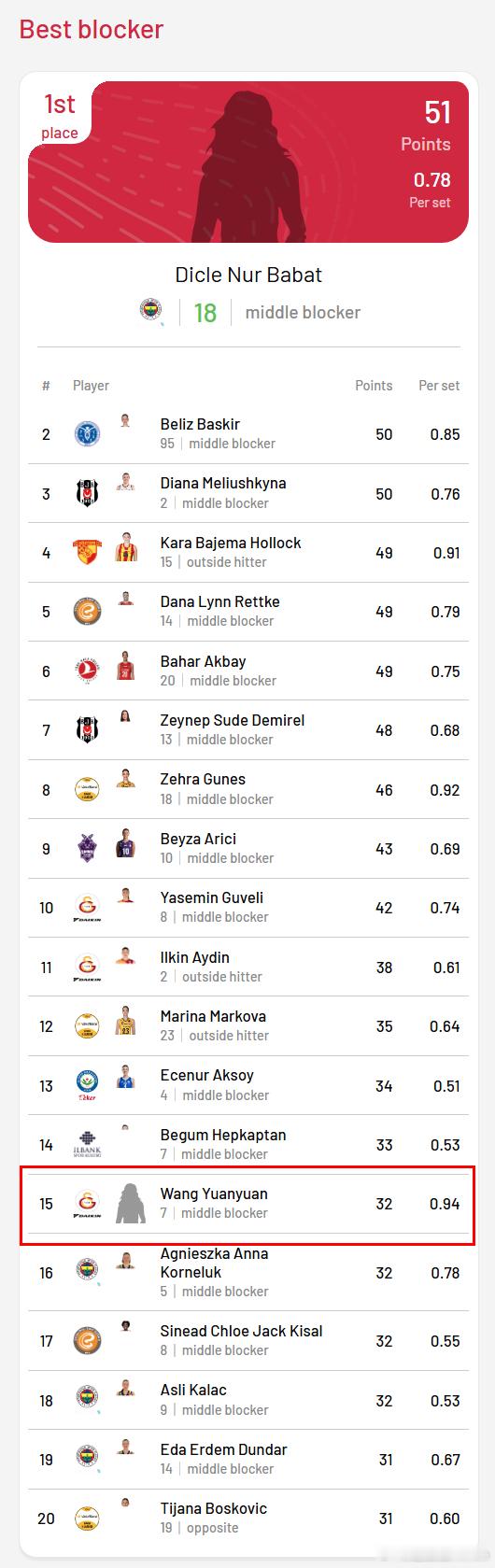 王媛媛留洋第一季 ⚡️ 加拉塔萨雷主场遭费内巴切零封,截至土超女排联赛截至第19轮,在积分榜上黄红军继续掉出前4;国手王媛媛的拦网总得分慢慢攀升,局均拦网得分稳居第一。
