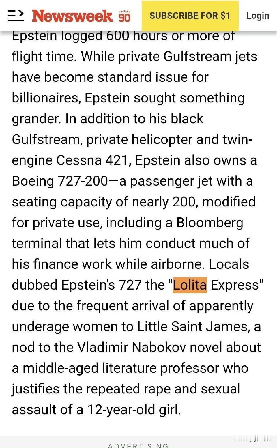 关于“萝莉岛”称呼的来源澄清…很多人误以为“萝莉岛”是中文网络自创的词汇,甚至将这个说法的源头归为国内网友,这其实是对背景的不了解。该称呼本质是对欧美原有表述的直译与沿用,核心源头来自西方文化与事件本身的命名。 “萝莉”一词最早脱胎于小说及电影《洛丽塔》,作品核心指向恋童相关题材,这一文化符号在西方早已和相关负面行为深度绑定。2016年,阿桑奇曝光克林顿家族与爱泼斯坦的关联文件,其中明确记载,当地将爱泼斯坦接送欧美权贵前往私人岛屿的专用航班,称作Lolita Express(洛丽塔快线),对应的岛屿也被西方网民和媒体称作“洛丽塔岛”,传入中文互联网后,被简化直译为“萝莉岛”。 这一叫法在欧美网络已存在十余年,搜索“Lolita express”,指向的均是爱泼斯坦相关事件,是西方原生的事件代称。中文网络只是直接沿用、直译了这一欧美既有的表述,并非凭空创造。若有人单纯以此指责中文语境、将源头按在中国网友身上,既不符合事实,也无视了该词汇的西方起源与长期使用历史。即便有人认为该表述存在弱化罪行的问题,也应追溯至西方原生语境,而非片面指责中文使用者。