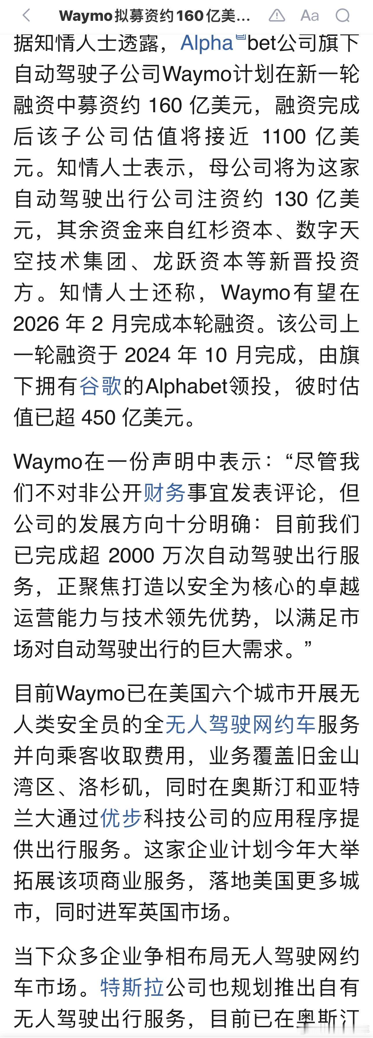 D轮融资: 在最近的 2025 至 2026 年初,Waymo 再次刷新了融资纪录,以约 1100 亿美元 的估值筹集了高达 160 亿美元 的资金。在这笔融资中,Alphabet 依然是最大的支持者,注入了约 75% 的份额,同时也引入了更多像红杉资本这样的风投。