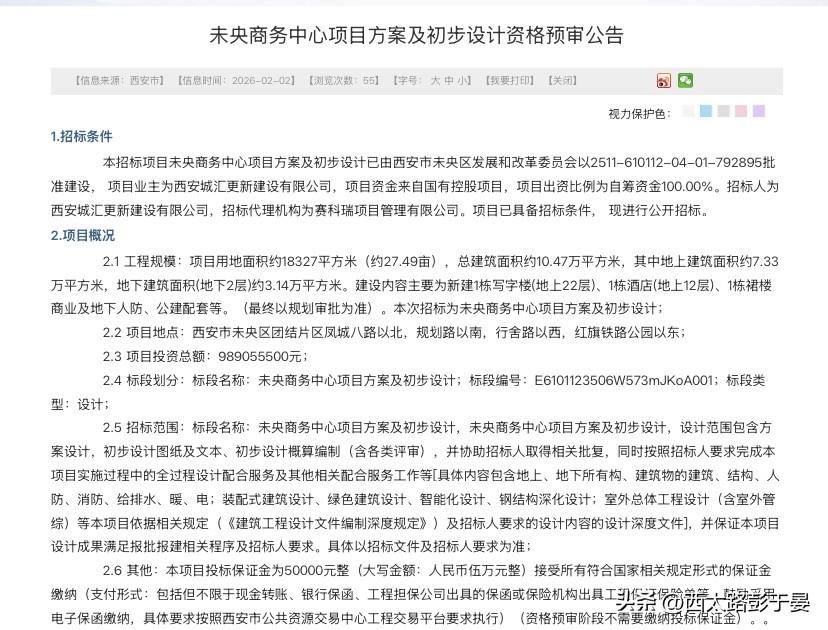 9.89亿商务新地标启动招标,西安未央团结片区迎发展新引擎 未央商务中心项目方案及初步设计资格预审正式开启,总投资98905.55万元,落子未央区团结片区凤城八路北侧、红旗铁路公园东侧,成为片区城市更新的核心发力点! 项目占地约27.49亩,总建面10.47万㎡,规划打造22层写字楼+12层酒店+裙楼商业的复合型商务集群,搭配地下2层人防及公建配套,地上7.33万㎡+地下3.14万㎡的空间布局,将填补区域高端商务配套空白,与已投用的未央金融中心形成金融+商务双核驱动格局,虹吸企业总部、专业服务机构及高端人才集聚。 作为西安三环内仅剩的成片开发热土,团结片区正迎来全面爆发:红旗铁路公园生态加持,4/10号线双地铁通达,龙湖未央天街商业配套成熟,爱知未央分校、团结实验学校等优质教育资源落地,医疗、康养配套同步完善。此次未央商务中心的启动,不仅将刷新城北城市界面,更将以产业协同激活区域经济活力,为未央区打造西安北部开放门户注入硬核动力! 未来这里将成为集高端办公、品质旅居、便民消费于一体的城市活力节点,见证西安城北商务版图的全新升级。 西安城建 未央发展