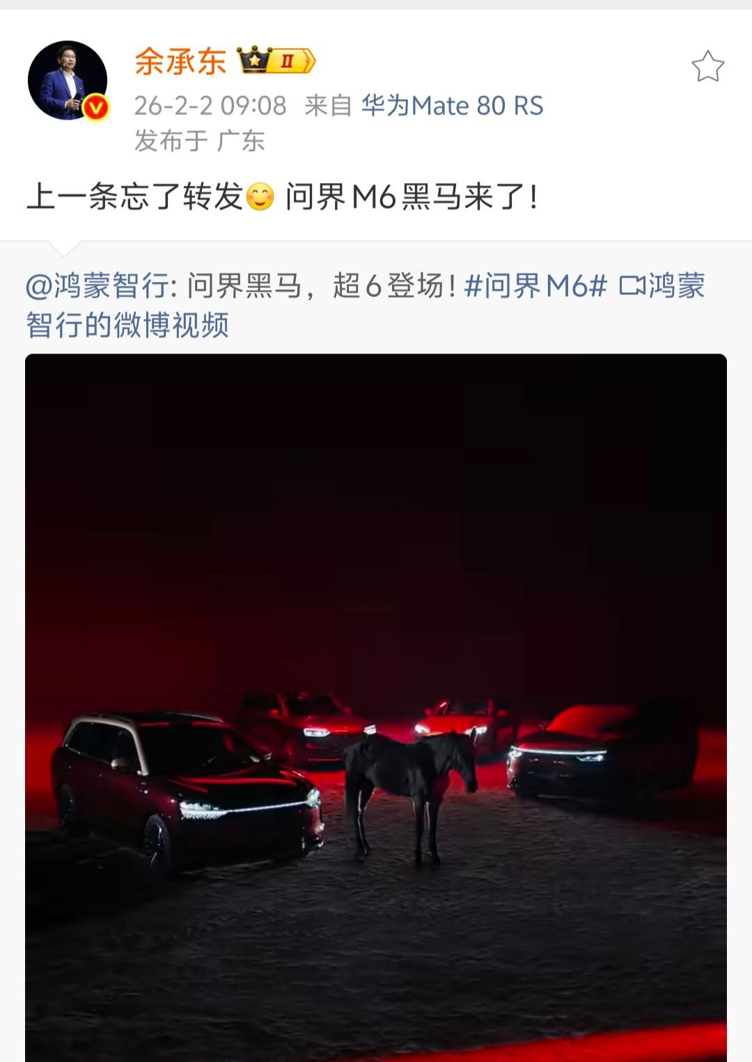 哈哈,余承东这忘性,有点可爱,一看这条官宣问界M6的动态就是余总本人发的。 2月2日一大早,余承东先是在8点18分发了一条微博,说问界的新王牌车型M6马上就要来了,这样一来,问界的“56789”产品矩阵就凑齐了,大家春天就能见到新车。可能是觉得这条消息太重要,没过一个小时,他又在9点08分补发了一条,还带着点小幽默地说“上一条忘了转发”,然后直接转发了鸿蒙智行的官方关于问界M6的预热视频,配文“问界M6黑马来了!”,用黑马的比喻来突出这款新车的重磅性。 余承东的这两条微博一发出,就把大家对问界M6的期待值拉满了,也标志着问界从M5到M9的SUV产品线终于完整了。 不过,在余承东转发的视频中并没有看到问界M6的真车,只看到了一匹黑色的骏马,喻意M6将以黑马的姿态亮相。 在余承东转发的鸿蒙智行官方视频中,黑马与M5、M6、M7、M8、M9五台车同框,直观展示了问界“56789”产品矩阵的完整阵容,凸显了问界的产品布局实力。 视频里代表M6的那匹“黑马”,既是一匹真实的黑色骏马,也是余承东对问界M6的比喻。我觉得,余承东应该是在暗示M6会像黑马一样在市场中突围,成为爆款车型。 这种带着点小迷糊又充满干劲的风格,恰恰是理工男余承东的标志性特点,也让这次官宣更显得真实又接地气。之前还有人说余承东的微博账号被收回去了,现在可以证伪了,余总的账号早就要回来了,哈哈! 新锐王牌问界M6即将登场 余承东
