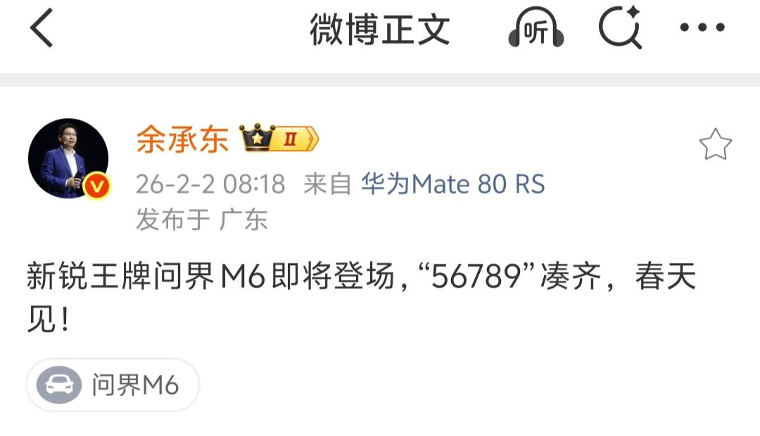 哈哈,余承东这忘性,有点可爱,一看这条官宣问界M6的动态就是余总本人发的。 2月