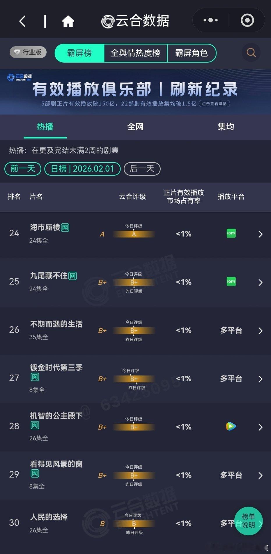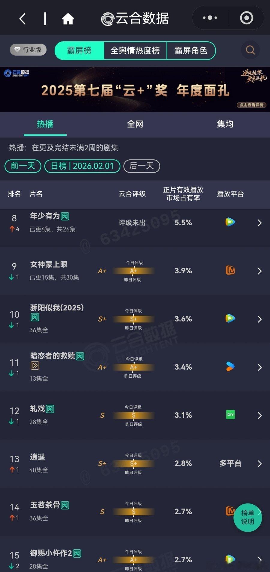 2月2日云合播放占比云合 太平年14.2%太平年cv柒夜 评级略有下降生命树9.4%生命树 破10就在眼前了,一点一点来吧有罪之身8.2%评级S+,算是播得不错的横屏短剧。罚罪2 6.9%还需要多苟几天,不然有卡9的风险。年少有为5.5%还不错女神蒙上眼3.9%