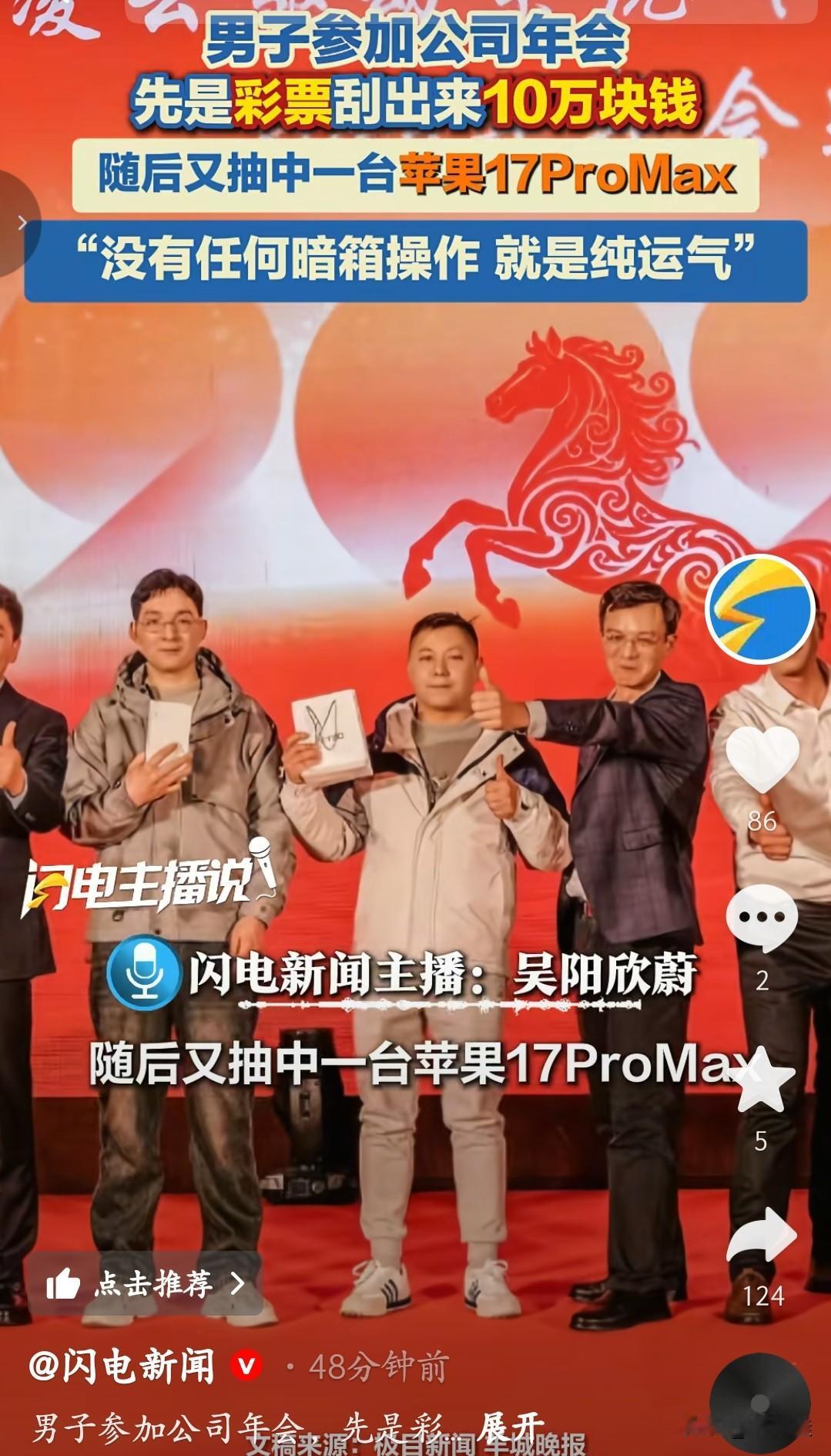 这位大哥绝对是今年年会的“锦鲤之王”!参加公司年会,他先是刮彩票中了10万块现金,紧接着抽奖又拿下一台苹果17ProMax,好运直接双杀。 他说“没有任何暗箱操作,就是纯运气”,这话听着让人又羡慕又替他开心。现场同事都忍不住为他鼓掌,这波福气真的挡都挡不住。 网友们纷纷留言,说这是把明年的运气都提前透支了,还有人调侃“这班还上什么,直接回家过年”。不得不说,这样的年会运气,真的是打工人做梦都想要的,太让人眼红了!