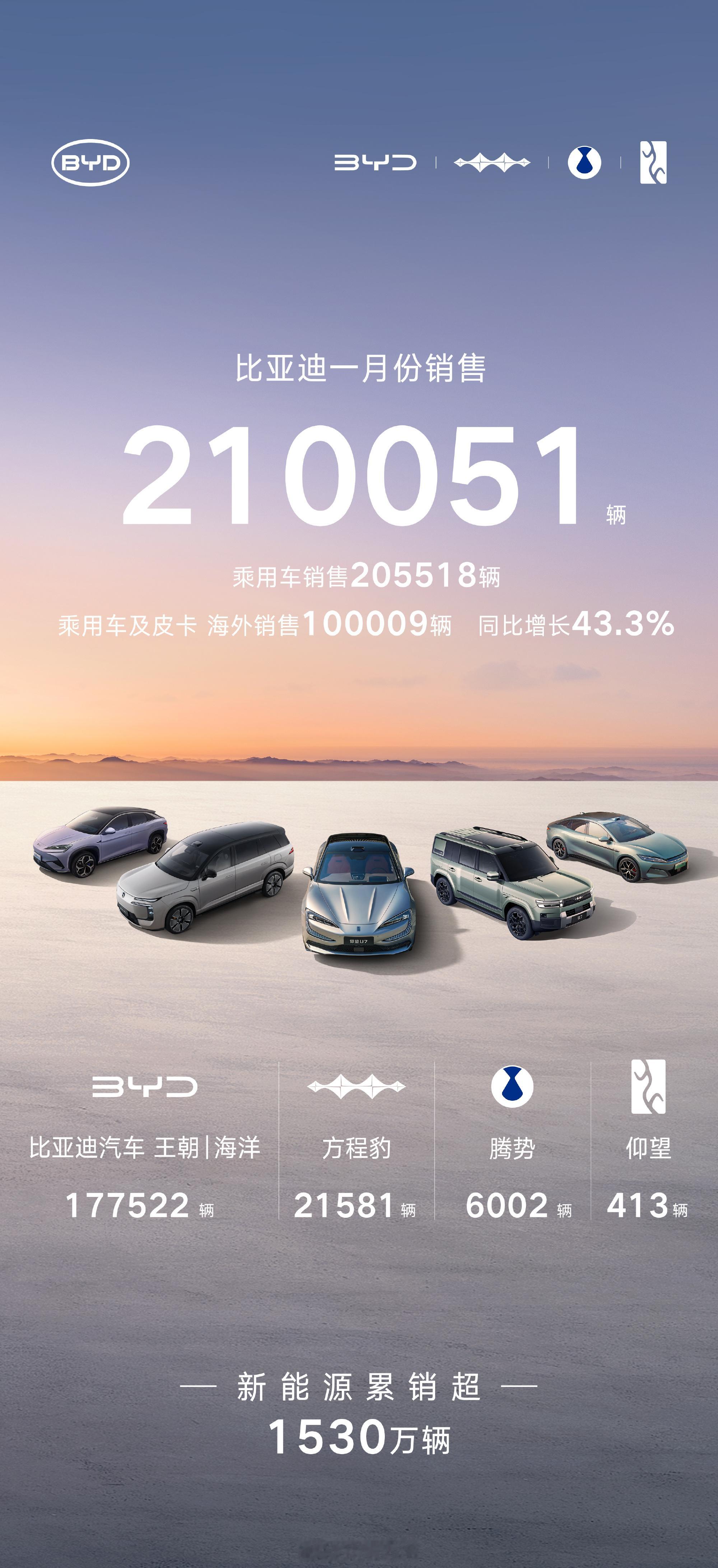 比亚迪1月销量210051台,海外销量破10万台 真猛啊!比亚迪