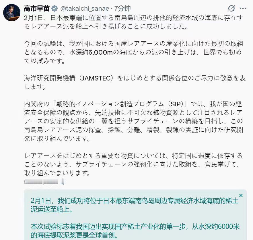 2月2日晚上,高市早苗在个人的社交媒体上,重点介绍了日本从海底开采稀土的突破性进展,强调避免在稀土等关键供应链上依赖特定国家。那么如何看待高市早苗的这番表态?日本真的这么快实现了稀土独立吗? 首先,高市早苗的发文当中重点强调了4个核心内容: 1是2月1号日本成功从南鸟岛周边的专属经济水域海底进行了稀土泥的开采; 2是这象征了日本稀土国产化的第1步; 3是从水深6000米提取稀土泥浆,其技术水平更是独步全球; 4是日本将继续推进南鸟岛稀土泥的勘探、开采、冶炼等相关工作,强化日本的供应链韧性,避免过度依赖特定国家。 实际上,从高市早苗这条发文下面的评论可以看出,这个举动还是极大振奋了日本普通民众的信心,以及民粹主义情绪。很多日本网友大赞日本先进的稀土技术,并期待能够很快实现商业化运用,摆脱对于中国的稀土依赖。2月8号众议院大选在即,这个时候发出这个消息,对于高市早苗的选情,显然又是一个极大的利好因素。谈了这么多年的稀土国有化和稀土独立,在高市早苗时代迈出了第1步,显然会造成极大的舆论宣传效果。 虽然从务实的角度来看,日本想持续从海底进行稀土开发和冶炼,面临着成本过高、技术难度过大等一系列不确定因素,走到商业化恐怕还需要很长的时间。但它鲜明地展现出了高市内阁对于中方出口管制措施的态度,那就是绝不妥协,想方设法也要实现日本的稀土独立。因此,无论日本方面付出多大的经济代价,日方在关键技术领域实现对华“脱钩”的大方向,恐怕是确定无疑的。如果高市内阁在此次选举当中大胜,实现政权的长期化,中日之间的对峙态势恐怕会在未来的2~3年之内延续下去,难以找到缓和的可能性与窗口。