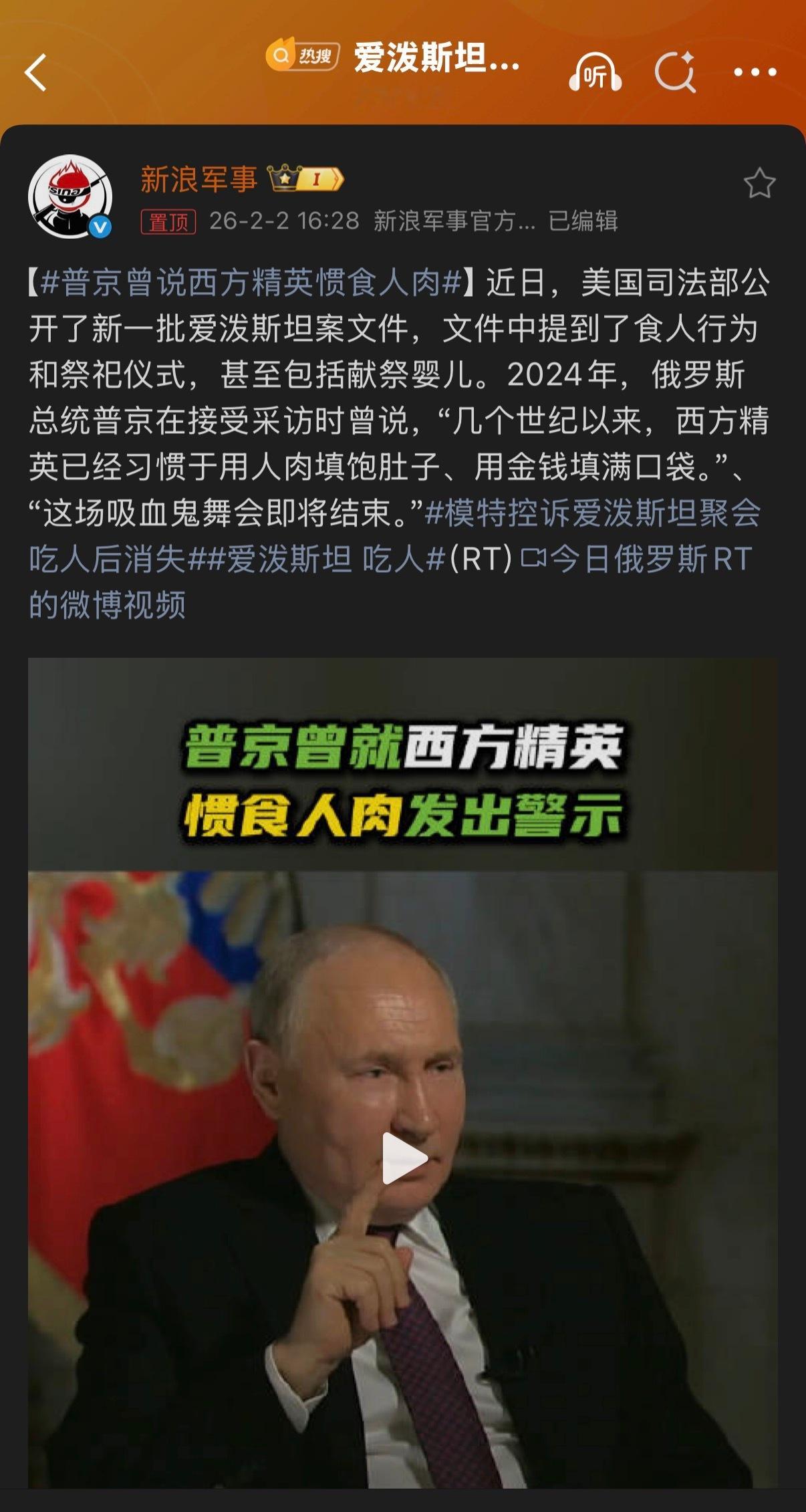 🔻当时很多人可能没有想到普京是这个意思的可能。🔻以为是比喻呢。普京曾说西方精英惯食人肉热点现场海外新鲜事