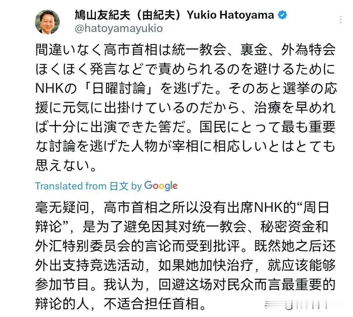一点情面都不给高市早苗留了!2月2日,鸠山由纪夫表示,高市早苗首相无疑是为了逃避因统一教会、政治献金、外汇特别账户失言等问题,才缺席了NHK的周日辩论。可她转头就精神满满地去为选举站台助选。如果她加快治疗,就完全可以出席节目。一个连对国民而言最关键的辩论都敢缺席的人,我实在无法认同她配当首相。 很显然,对于高市早苗缺席周日辩论一事,鸠山由纪夫一点情面都没有给高市早苗留。鸠山的意思很清楚,高市早苗精神饱满的为竞选站台,却以身体不舒服为由,拒绝面对日本公众,本质上就是要优先保选举,回避被问责。事实上,自民党称手臂不适上月已出现,助选时握手、演讲都无碍,一到辩论就“伤重”,这种说辞显然非常的缺乏说服力。 1月31日,高市早苗声称“日元贬值,日本靠外汇赚得盆满钵满”,这在日本物价持续上涨的背景下,高市早苗的言论引发极大争议。而自民党支部被曝2012、2019年收受原统一教相关团体的“派对券”献金,这与她此前“无金钱往来”的公开表态直接矛盾。高市早苗估计也没有想好如何自圆其说,所以只能选择逃避。鸠山这一次对高市早苗发难,无疑打的非常的精准。鸠山站出来,当然是不希望日本被高市早苗带上不归路。因此,要挫一挫高市早苗的气焰。