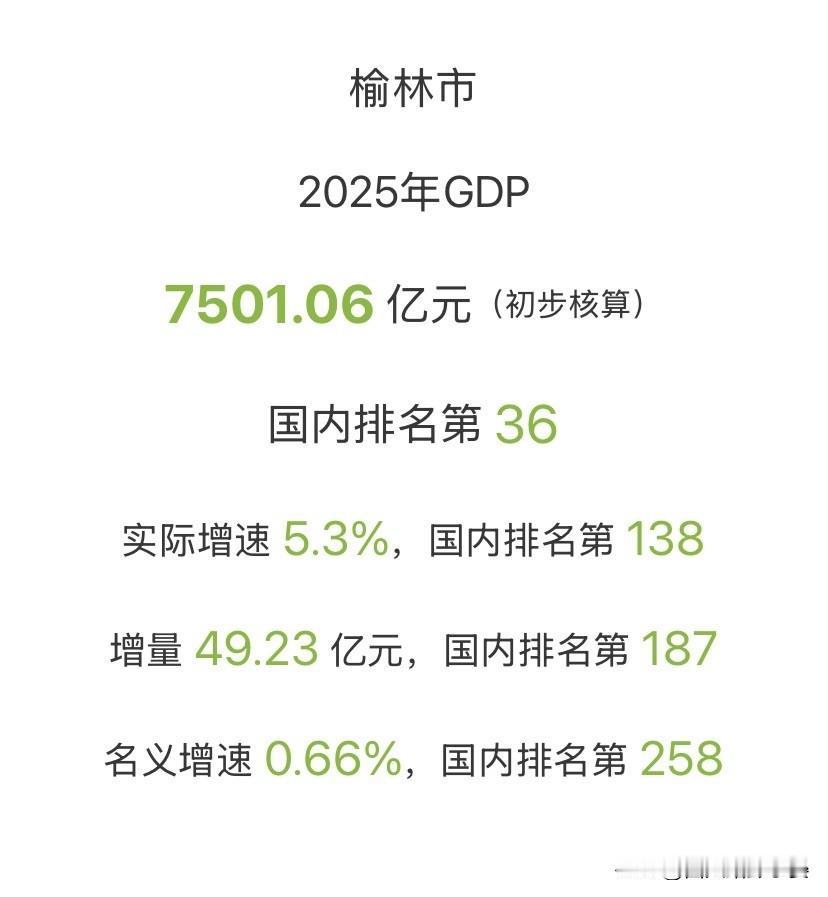 榆林2025年GDP出炉:增速反差有点大 刚看到榆林2025年的GDP数据,直接给我整懵了!数据显示,GDP总量:7501.06亿元,稳进全国前50,实际增速:5.3%,看起来还行。 但名义增速只有0.66%,增量才49.23亿,这反差感直接拉满! 说白了,作为靠能源吃饭的城市,榆林的GDP就像坐过山车——能源价格涨的时候一路狂飙,价格跌了就立马踩刹车。