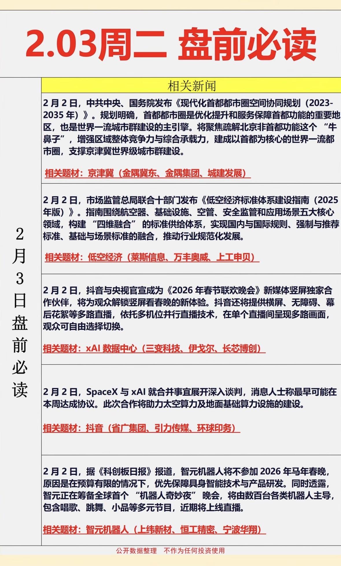 2月3日盘前必读新闻热点资讯汇总 "首都都市圈规划发布,低空经济迎标准指南,抖音合作春晚推竖屏体验,SpaceX或合并xAI,智元机器人筹备全球机器人晚会。"