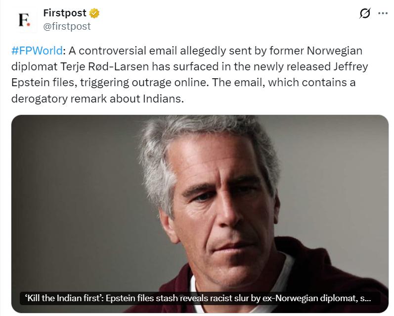 前挪威外交官泰耶·罗德-拉尔斯曾对印度人发表过贬损言论,这一言论在新公布的杰弗里·爱泼斯坦档案中被曝光。 美国司法部(DOJ)公布了与已定罪的性犯罪者爱泼斯坦有关的约三百万页文件。其中有一封据称来自罗德-拉森的电子邮件,其中包含对印度人的侮辱性言论。根据该文件,这封邮件是作为一封转发给他的印度政客的消息的回应而发出的。该邮件的日期为 2015 年 12 月 25 日,内容为:“你听说过这样一句话吗:当你遇到一个印度人和一条蛇时,先杀了印度人!” 特耶·罗德-拉尔斯森是谁? 罗德-拉尔斯登是一位前挪威外交官和联合国特使,还曾担任国际和平研究所所长。2020 年,他的名字与爱泼斯坦的关联事件有关,他因此从该研究所辞职。 这封邮件在社交媒体上引发了广泛的强烈反应。用户们纷纷谴责这一言论,有人写道:“这太荒唐了”,而另一个人则在X上发文称:“他们全都不喜欢印度人。”