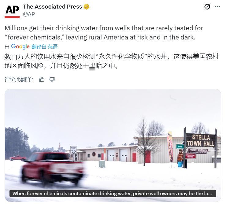 美联社:数百万人的饮用水来自很少检测“永久性化学物质”的水井,这使得美国农村地区面临风险,并且仍然处于黑暗之中。