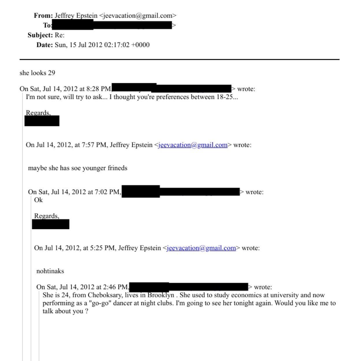 “也许她有一些更年轻的朋友”——爱泼斯坦因年龄问题拒绝了一位24岁的俄罗斯模特。 据Mash报道,这位“来自切博克萨雷,现居布鲁克林”的模特甚至在《疾速追杀3》中客串出演。 对爱泼斯坦来说,她已经太老了。