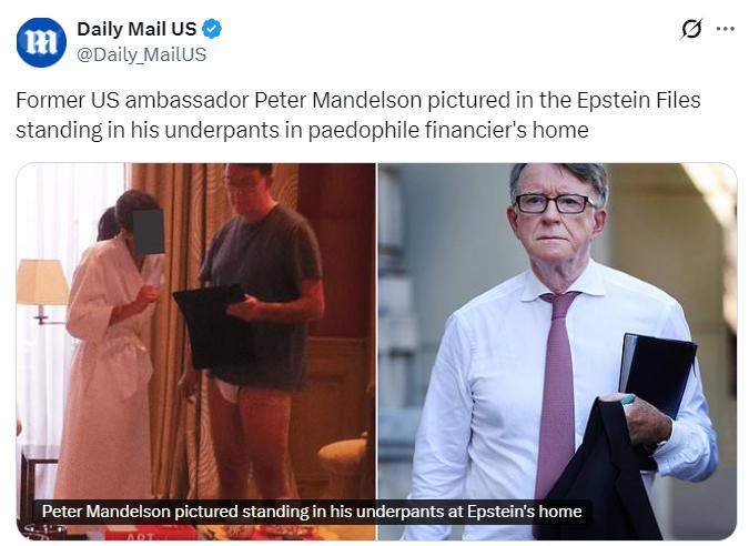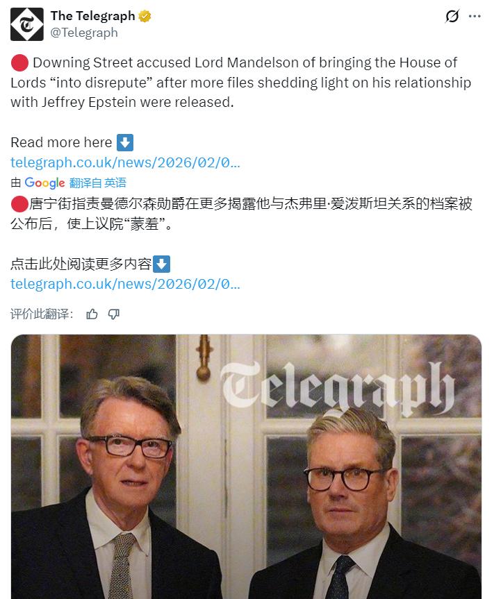 唐宁街指责前驻美国大使“玷污了上议院的声誉”,原因是美国司法部公布了更多有关他与爱泼斯坦关系的文件。 周日有消息称,在戈登·布朗担任首相期间,曼德尔森勋爵曾将唐宁街的机密文件泄露给了性侵案嫌犯。 首相斯塔默受到了保守党和工党高层政客们的强烈要求,他们呼吁剥夺曼德尔森勋爵的贵族头衔。 周一,他的官方发言人表示:“首相已要求对此问题进行紧急调查,首相认为彼得·曼德尔森不应成为上议院议员,也不应使用这一头衔。” “然而,首相无权废除这一规定。他呼吁上议院的议员们与政府合作,对议会的纪律措施进行现代化改革,以便能够更轻松地解除那些给议会带来不良影响的议员的职务。 首相已要求内阁秘书审查有关彼得·曼德尔森在其担任政府部长期间与杰弗里·爱泼斯坦接触的所有相关信息,并向他汇报结果。