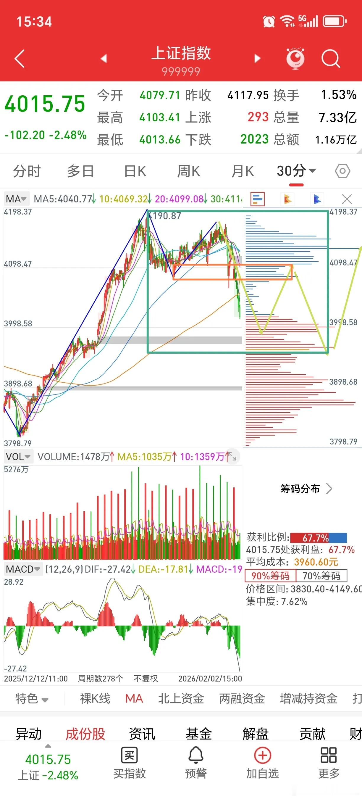 我不相信这里就结束了牛市! 指数今天大跌,量能2.58万亿。明天将有可能考验4000关口,今年第一个交易日还留有一个日线跳空缺口3977,看样子也有机会回补! 图一30分钟图这一笔下跌力度不背,多震荡调整一下还有30分盘整上涨的可能。图二表示从高点回落了一个30分盘整下跌,此时把放大镜倍数调大,用非同级别分解来看,从3815可以看做日线中枢盘整上涨。图三5分钟图,底部还要调整一下缓解下跌力度,今天的一分中枢3卖威力巨大,会不会做第二个一分下跌中枢有待观察。 操作策略:这里不宜看空,调整结束后仍有新高,满仓抗过了调整,我不相信这里就结束了牛市!股市分析
