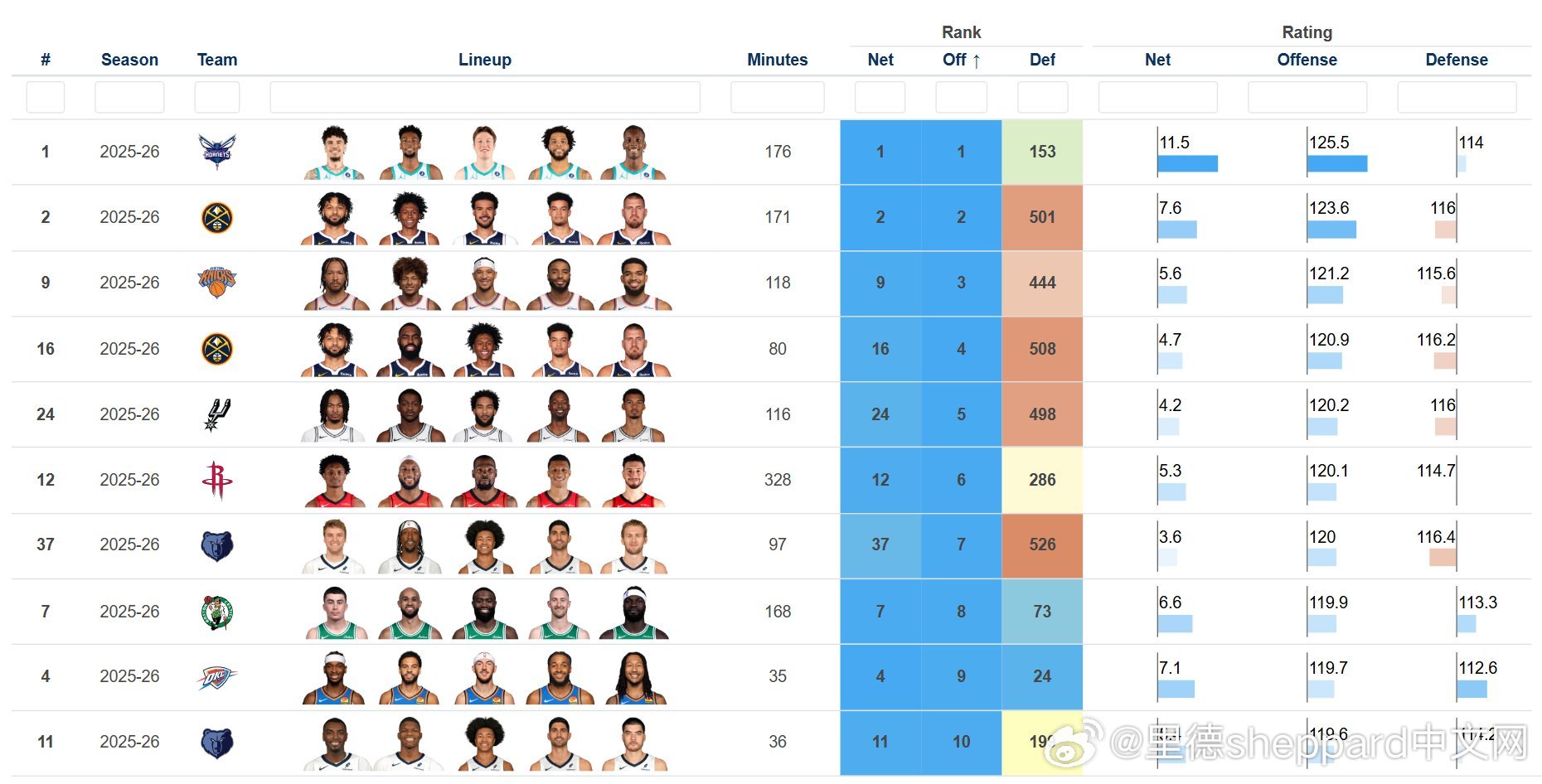 火箭首发阿门/奥科吉/贾巴里/杜兰特/申京的进攻效率120.1排在第6, Net +5.3排名第12夏洛特黄蜂nbaNBA