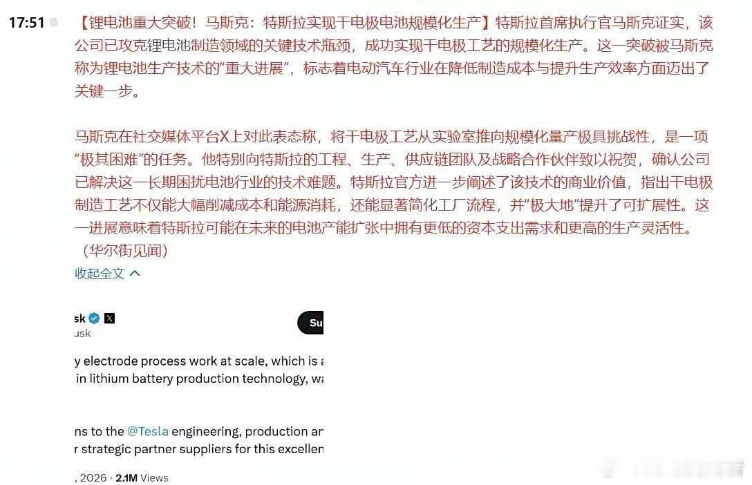明天估计这一板块要起飞!特斯拉宣布实现干电极电池规模化生产,这一技术突破被称为锂电池领域的“重大进展”,核心优势在于大幅降低制造成本、简化生产流程、提升能源利用效率与产能扩展性。该事件将直接带动干电极产业链的材料、设备、结构件等环节需求爆发,短期具备强烈情绪催化,中长期则开启锂电产业技术升级的新周期。受益概念股梳理分析1. 璞泰来:锂电材料龙头,布局干电极专用粘结剂与复合铜箔,技术深度适配特斯拉需求,受益于干电极规模化生产,订单增长明确,具备长期成长属性。2. 天奈科技:碳纳米管导电剂全球龙头,产品适配干电极工艺以提升导电效率,技术壁垒高,受益于特斯拉供应链拓展,业绩弹性充足。3. 先导智能:锂电设备核心企业,提供干电极涂布与成型设备,技术实力突出,受益于特斯拉产能扩张,订单增长确定性强,获机构持续关注。4. 杉杉股份:锂电材料核心企业,布局干电极导电剂与硅基负极材料,技术适配性强,受益于产业趋势,订单增长明确,具备成长属性。5. 中科电气:负极材料龙头,研发适配干电极的高容量硅基负极,技术壁垒高,受益于特斯拉技术升级,业绩弹性充足,资金关注度高。6. 赢合科技:锂电设备核心企业,布局干电极产线整线装备,技术适配性强,受益于产能扩张,订单增长潜力大,具备成长属性。7. 恩捷股份:湿法隔膜龙头,同步布局干法隔膜适配干电极工艺,技术壁垒高,受益于特斯拉供应链拓展,业绩稳健具备防御性。8. 星源材质:干法隔膜核心企业,产品直接适配干电极需求,技术实力突出,受益于产业趋势,订单增长弹性充足,获资金认可。9. 宁德时代:动力电池全球龙头,储备干电极技术并推进产业化,受益于行业技术升级,供应链协同效应强,业绩确定性高。10. 容百科技:正极材料龙头,研发适配干电极的高镍三元正极,技术壁垒高,受益于特斯拉技术迭代,业绩弹性充足,获机构关注。11. 当升科技:正极材料核心企业,布局干电极适配的高电压正极材料,技术适配性强,受益于产能扩张,订单增长明确。12. 科达利:电池结构件龙头,提供干电极电池专用壳体与盖板,技术适配特斯拉需求,受益于产能扩张,业绩稳健具备成长属性。13. 嘉元科技:铜箔核心企业,研发复合铜箔适配干电极工艺以提升能量密度,技术壁垒高,受益于特斯拉供应链拓展,订单增长弹性充足。14. 诺德股份:铜箔核心企业,布局复合铜箔技术适配干电极需求,技术实力突出,受益于产业趋势,获资金持续关注。15. 杭可科技:锂电设备核心企业,提供干电极后段处理设备,技术适配性强,受益于产能扩张,订单增长明确,具备成长属性。16. 国轩高科:动力电池核心企业,储备干电极技术并推进量产,适配新能源汽车需求,受益于行业技术升级,订单增长潜力大。17. 中材科技:锂电隔膜核心企业,布局干法隔膜技术适配干电极需求,技术实力突出,受益于产业趋势,具备防御性与成长属性。18. 科恒股份:锂电设备核心企业,布局干电极涂布与烘干设备,技术适配特斯拉需求,受益于产能扩张,订单增长明确。19. 比亚迪:动力电池核心企业,研发干电极相关技术适配自研车型,受益于产业趋势,订单增长明确,具备龙头属性。20. 翔丰华:负极材料核心企业,研发适配干电极的人造石墨负极,技术适配性强,受益于特斯拉供应链拓展,业绩弹性充足。总结特斯拉干电极电池的规模化生产,标志着锂电产业技术升级进入实质性落地阶段,将直接带动材料、设备、结构件等全产业链需求爆发。短期情绪催化明确,中长期产业趋势确定性强,建议优先选择技术壁垒高、订单明确的龙头标的,规避纯题材炒作,把握产业升级带来的结构性机会。今日看盘上证指数a股