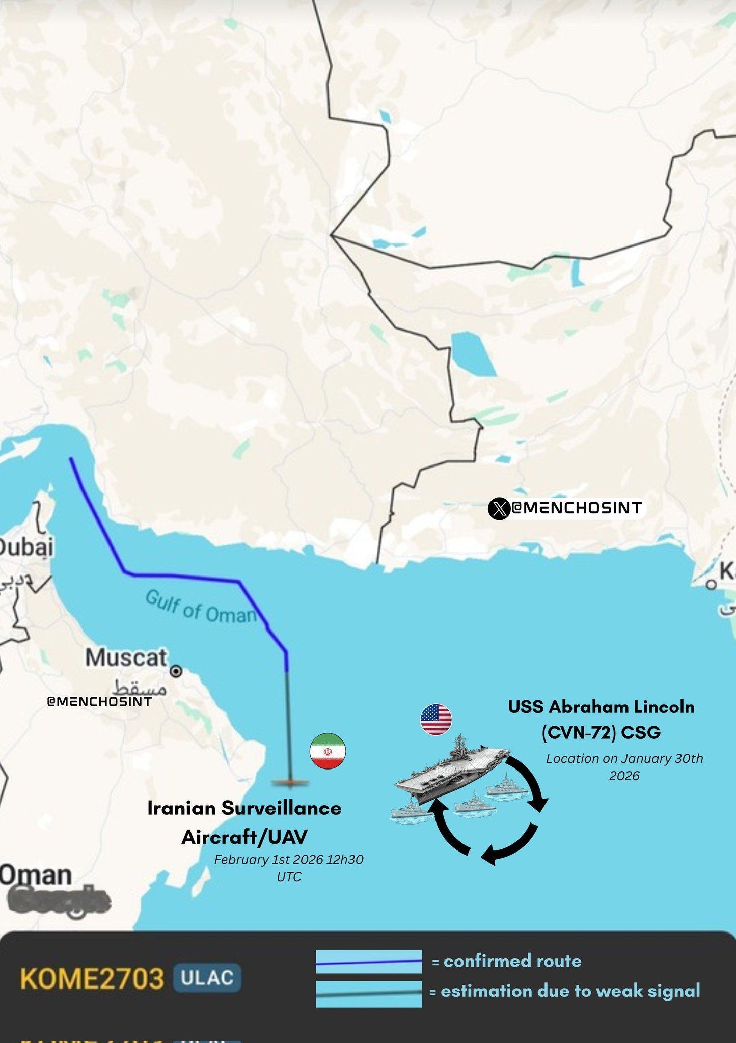 🔻伊朗革命卫队远程高空不明飞行器/无人机开始沿伊朗西部边境巡逻(图1)。🔻目前仍不清楚具体型号,该飞行器昨日也曾飞越美国林肯号航母所在区域(KOME2703 十六进制代码 730000,图2)🔻via F24伊朗总统已下令启动核谈判爱泼斯坦档案泄露或加快伊朗遇袭海外新鲜事热点现场