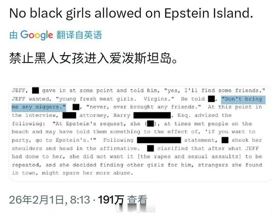 爱泼斯坦案公开文件显示,他不允许带黑人女孩上萝莉岛,甚至直接用N字和鼻涕虫这样的词语辱骂。但他对白人和亚裔幼龄女孩却十分喜爱。所以,美国黑人网民讽刺说,感谢种族歧视,这次让黑人少女比白人少女更安全。