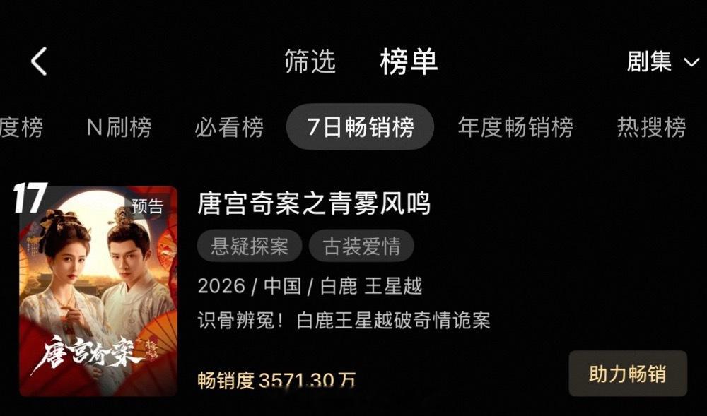 白鹿唐宫奇案优酷拉新周榜来到17了