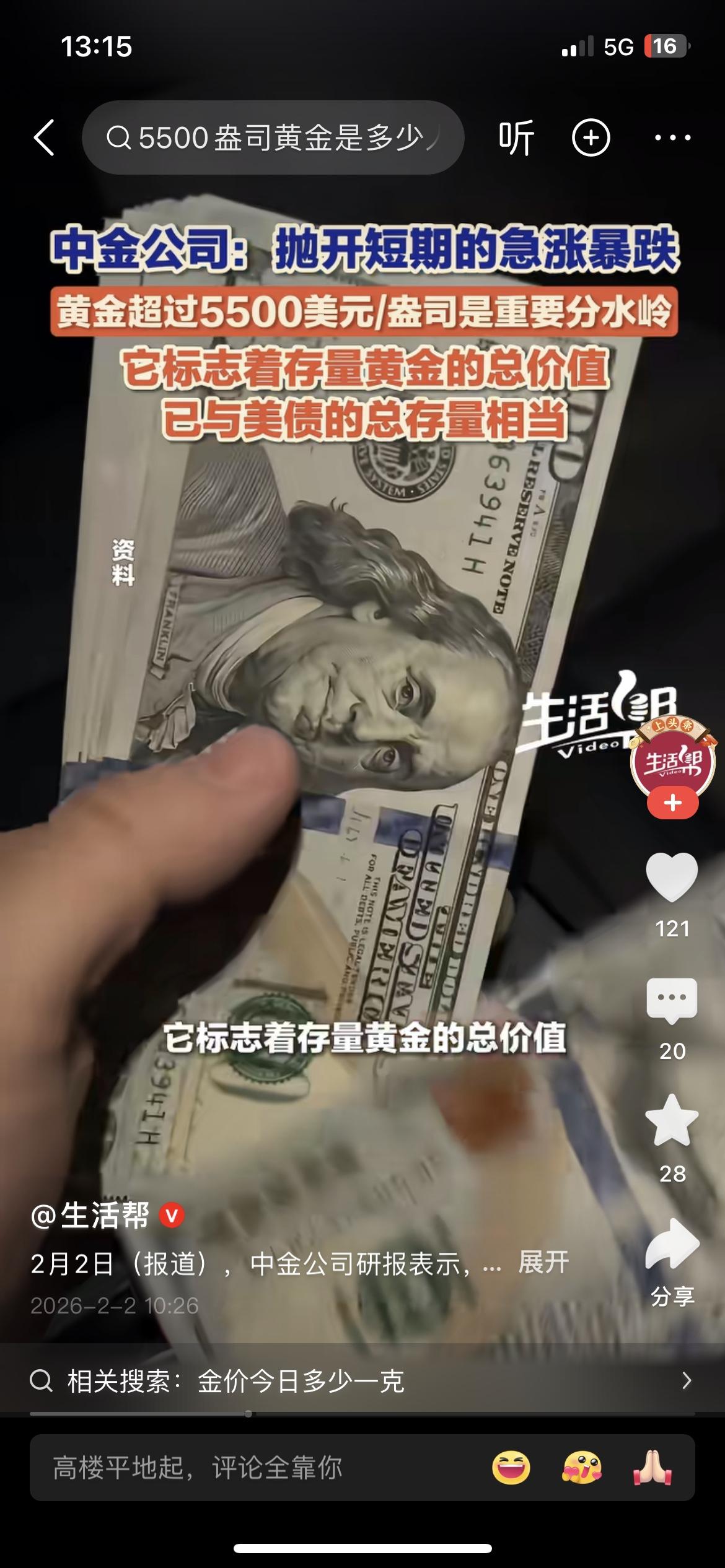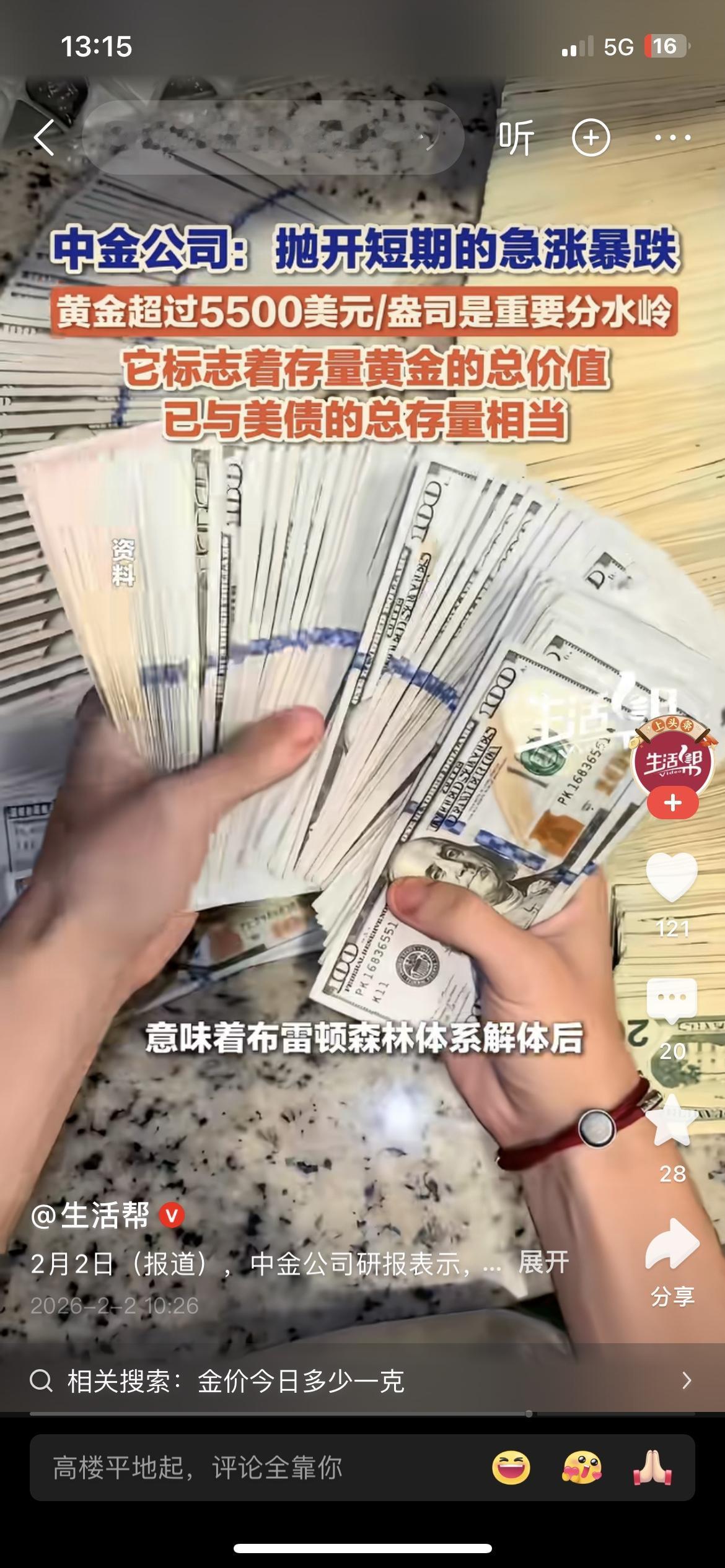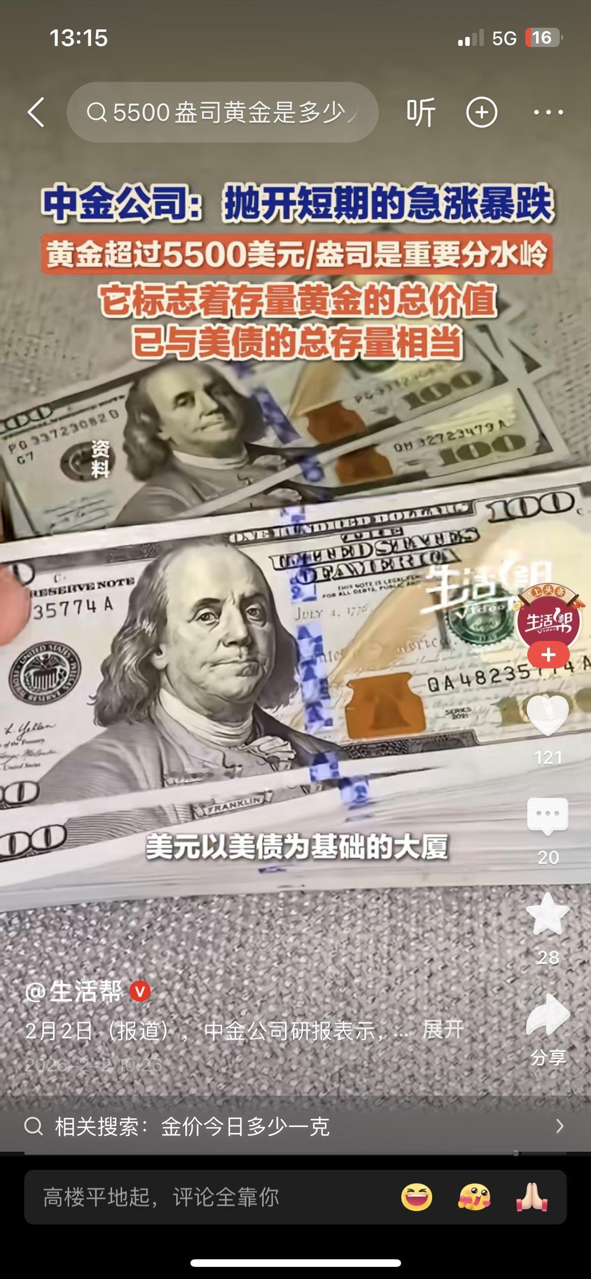 中金重磅发声!黄金突破5500美元是分水岭,牛市还能继续吗? 我做金融分析的朋友,拿着中金的研报跟我分析,说黄金突破5500美元后,长期走势依然向好;之前抄底黄金的张叔,看到研报后更坚定了补仓的想法,说要长期持有。 中金公司最新研报指出,黄金突破5500美元/盎司是重要分水岭,存量黄金与美债总价值相当,全球货币宽松预期下,黄金的长期避险价值凸显,短期暴跌只是获利盘出逃,不影响长期牛市。 短期波动是插曲,长期趋势才是关键。 市场有风险,投资需谨慎。 你认同中金的观点吗?觉得黄金的长期牛市还能持续吗? 中金谈黄金 黄金理财