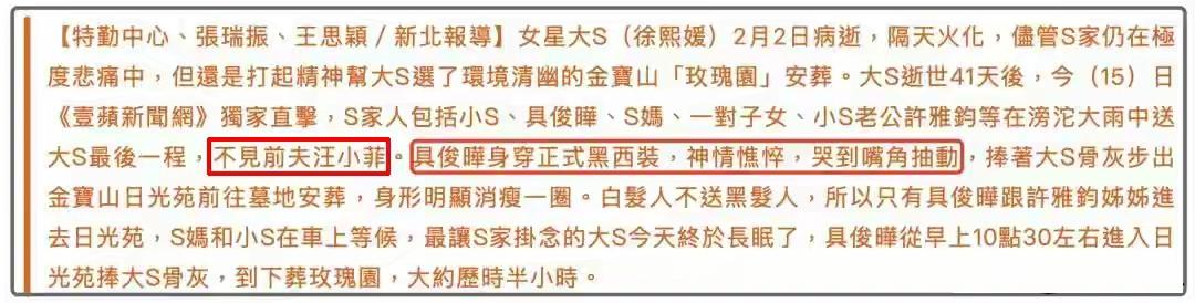 果然,汪小菲昨天又被蛐蛐了,有些自媒体在盛赞欧巴深情浪漫的时候,把汪小菲又拉出来作对比。 大S生前就是喜欢浪漫的人,所以,她下葬的时候是一个浪漫的雨天、周年纪念日也是一个浪漫的雨天。那飘飞的细雨啊,彷佛是上天也为善良温柔的她,落下了眼泪。 还是一个下雨天,还是那群悲伤又怀念的人,还是缺席了大S最惦记的人(玥儿和箖箖),虽然不理解但是尊重。 不一样的是,这次欧巴倾注一年的心血精心为大S设计的雕像,正式揭幕。不得不说,欧巴真的是深情又浪漫,虽然很多人都说雕像没有一点大S的影子、很抽象,但是这就是欧巴心中熙媛的模样,还是曾经那个和他初恋的少女、错过的青春。 只可惜,这种悲情和浪漫还是被各种不一样的声音给打乱了,有人盛赞欧巴,就有人把汪小菲这个前夫哥拉出来鞭笞。有些人竟然罔顾S家拒绝汪小菲和孩子们入园纪念的事实,硬生生造谣说“汪小菲不让两个孩子去悼念母亲,当初入土的时候也是这样……” 他们是忘了还是特意要混淆试听呢?下葬的时候,那个S家的嘴替张振瑞还发布了假新闻,说“大S一双儿女送最后一程,不见前夫汪小菲”……到底是谁在撒谎,还不是一目了然吗? 大S是很多粉丝都喜欢的明星,可惜总有人借着对她的怀念消费热度,一边捧着虚假的浪漫,一边歪曲事实诋毁他人,把一场悼念变成了博眼球的闹剧,寒了真正喜欢她的粉丝的心。大家不过是想好好怀念这个温柔的人,别再让无谓的纷争消耗这份热爱,愿岁月温柔,让她的美好留在时光里,一切纷扰都能慢慢过去。