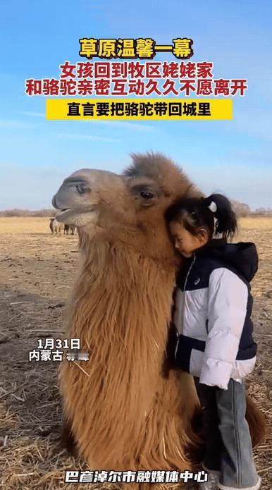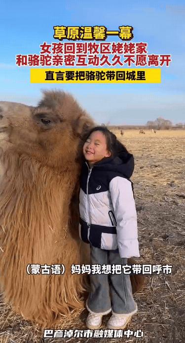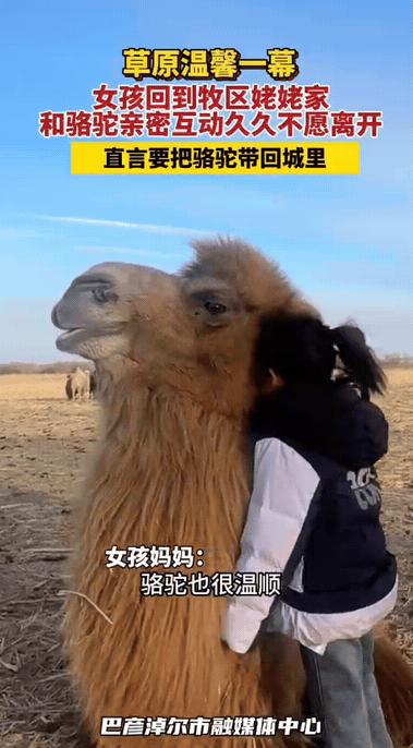 萌化了!赤峰女子带女儿回娘家,她 8 岁的女儿,迷上了姥姥家的骆驼,这骆驼趴地上,眯着眼睛,任凭这孩子怎么抚摸,怎么亲近,都那么静静的呆着,温柔的像尊石像 。 女儿还和妈妈说,想让姥姥把骆驼送她做礼物,回去的时候要把骆驼带回家当宠物养着 。 赤峰一位女子趁着空闲,带着8岁的女儿回娘家小住,原本只是一场寻常的探亲之旅,却因为姥姥家的一峰骆驼,多了许多暖心又好笑的小插曲。 女儿第一次近距离见到骆驼,瞬间被这头身形高大却模样憨厚的“大家伙”吸引,一头扎进姥姥家的驼圈就不愿走,连平日里最爱的玩具、零食都被抛到了脑后。 女子看着女儿与骆驼亲密互动的模样,随手用手机记录下来,没想到分享到网上后,快速走红,戳中了不少网友的柔软心底。 女子的娘家在赤峰本地,家里养着骆驼,这也是女儿第一次这么近距离接触这种动物。刚见到骆驼时,女儿还有些胆怯,远远地站在一旁打量,看着这头身形高大、背着驼峰的“大家伙”,眼神里满是好奇,不敢轻易上前。 让人意外的是,这峰骆驼格外温顺,完全没有大型动物的凶悍模样,始终乖乖趴在地上,眯着眼睛,脑袋微微耷拉着,一副慵懒又乖巧的姿态,仿佛看穿了小女孩的胆怯,在主动拉近彼此的距离。 犹豫了许久,女儿才鼓起勇气,慢慢挪动脚步走上前,先是伸出指尖轻轻碰了碰骆驼的绒毛,见骆驼没有丝毫反抗, 只是轻轻眨了眨眼,她才渐渐放下顾虑,愈发大胆起来,伸手细细抚摸骆驼的脊背、脖颈,动作轻柔又小心翼翼,生怕惊扰到这个温柔的伙伴。 这峰骆驼也格外有耐心,任凭孩子怎么亲近、抚摸,甚至轻轻拽它的绒毛,都稳稳待在原地,不恼不躁,高大身形与温顺性子的反差感直接拉满,看得家人满心欢喜。女儿还说要把她带回城市里养着,妈妈听到都笑了。 不少网友被这份童真和骆驼的温顺治愈,留言表示:“太萌了!小朋友的喜欢纯粹又热烈,骆驼也超级温柔,这画面太治愈了” “童年的快乐就是这么简单,喜欢就想一直带在身边,太能理解这个小姑娘了”,还有网友分享自己的经历,说小时候也想把喜欢的小动物带回家,这份天真格外珍贵。 女子听着女儿的诉求,结合网友们提到的种种情况,既觉得孩子的天真十分可贵,又有些无奈,只能耐心跟女儿解释不能把骆驼带回家的原因, 告诉她骆驼需要广阔的空间生活,家里的环境无法好好照顾它,而且饲养骆驼是一件需要长期坚持的大事,现在还没有能力承担这份责任。 女儿听完后,虽然满脸不舍,慢慢低下了头,但也似懂非懂地点了点头,不再执着于把骆驼带回家。见女儿这般懂事,女子便答应她,以后每次回娘家,都好好陪骆驼玩耍,留住这份特别的欢喜。 这份孩童的纯粹喜爱,搭配上骆驼的温顺憨厚,成了这段回娘家之旅中最温暖的小插曲,也引发了大家对“喜欢与占有”的思考。 对此,你们有什么看法,欢迎评论留言~