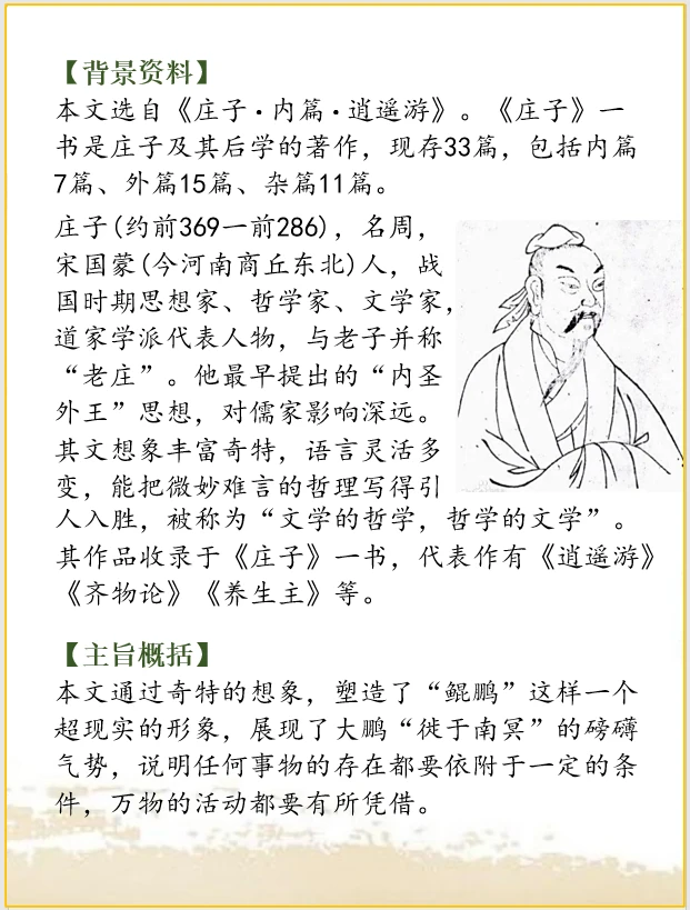 本文选自《庄子·内篇·逍遥游》。《庄子》一书是庄子及其后学的著作,现存33篇,包括内篇7篇、外篇15篇、杂篇11篇。