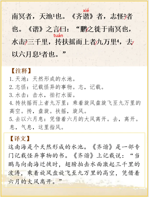 这只鹏鸟啊,当海水运动之时就要迁徙到南海去。这南海是个天然形成的水池。《齐谐》是一部专门记载怪异事物的书。《齐谐》上记载说:“当鹏鸟向南海迁徙时,翅膀拍击水面激起三千里的波涛,乘着旋风盘旋飞至九万里的高空,凭借着六月的大风离开。”山野中的雾气,空气中的尘埃,都是生物用气息吹拂的结果。