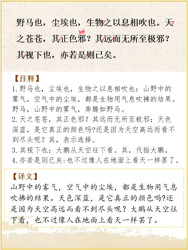 天色深蓝,是它真正的颜色吗?还是因为天空高远而看不到尽头呢?大鹏从天空往下看,也不过像人在地面上看天一样罢了。