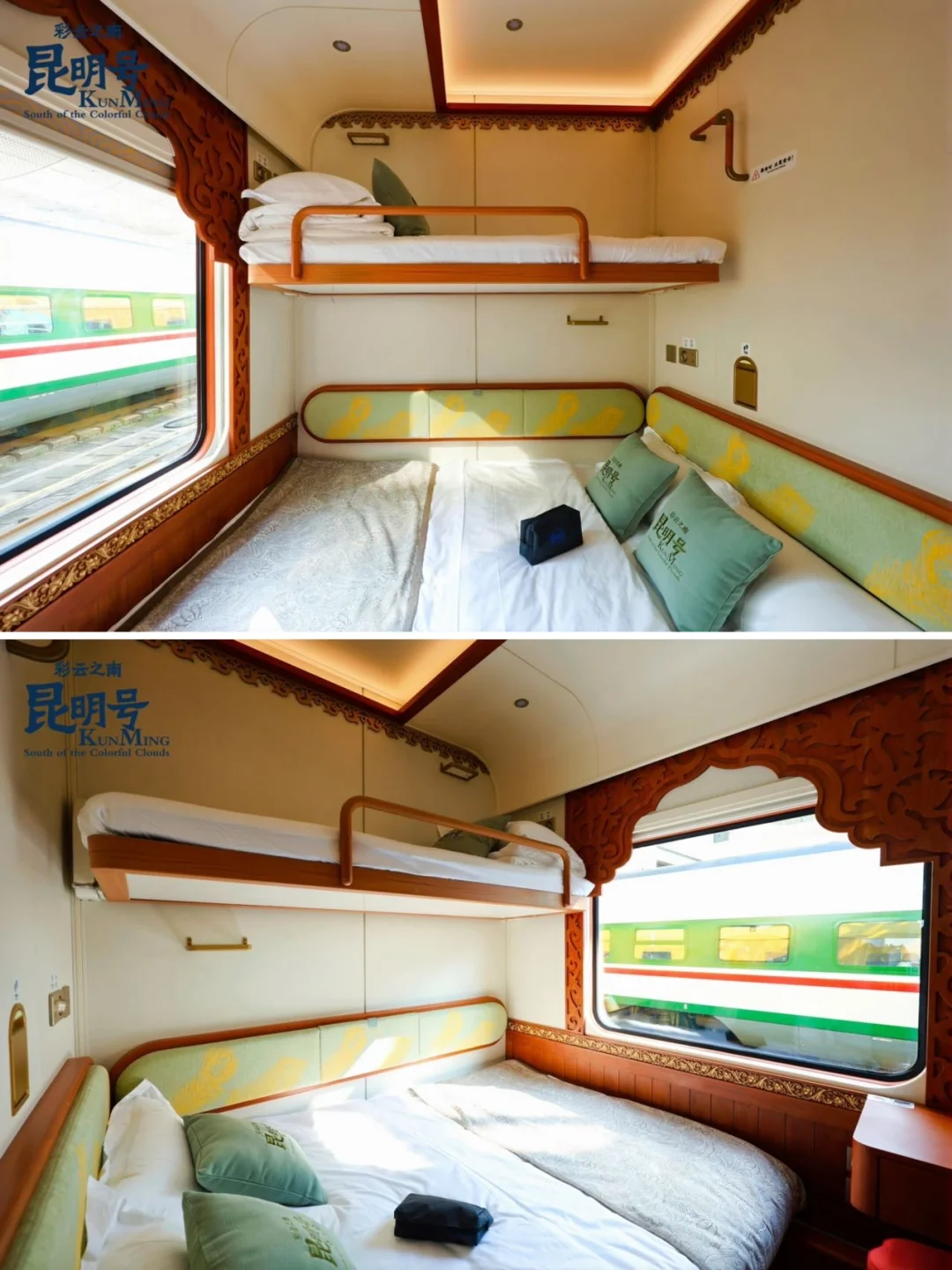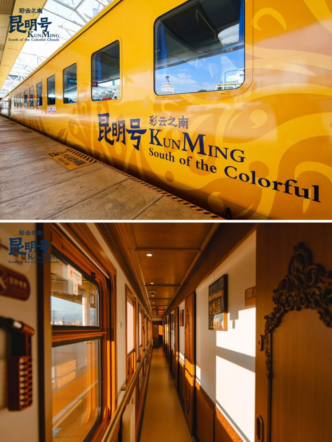 第一眼在昆明站见到昆明号,真的有被惊艳到。整列火车通体绘着金色孔雀图案,在阳光下闪闪发亮,不愧是春城的象征。