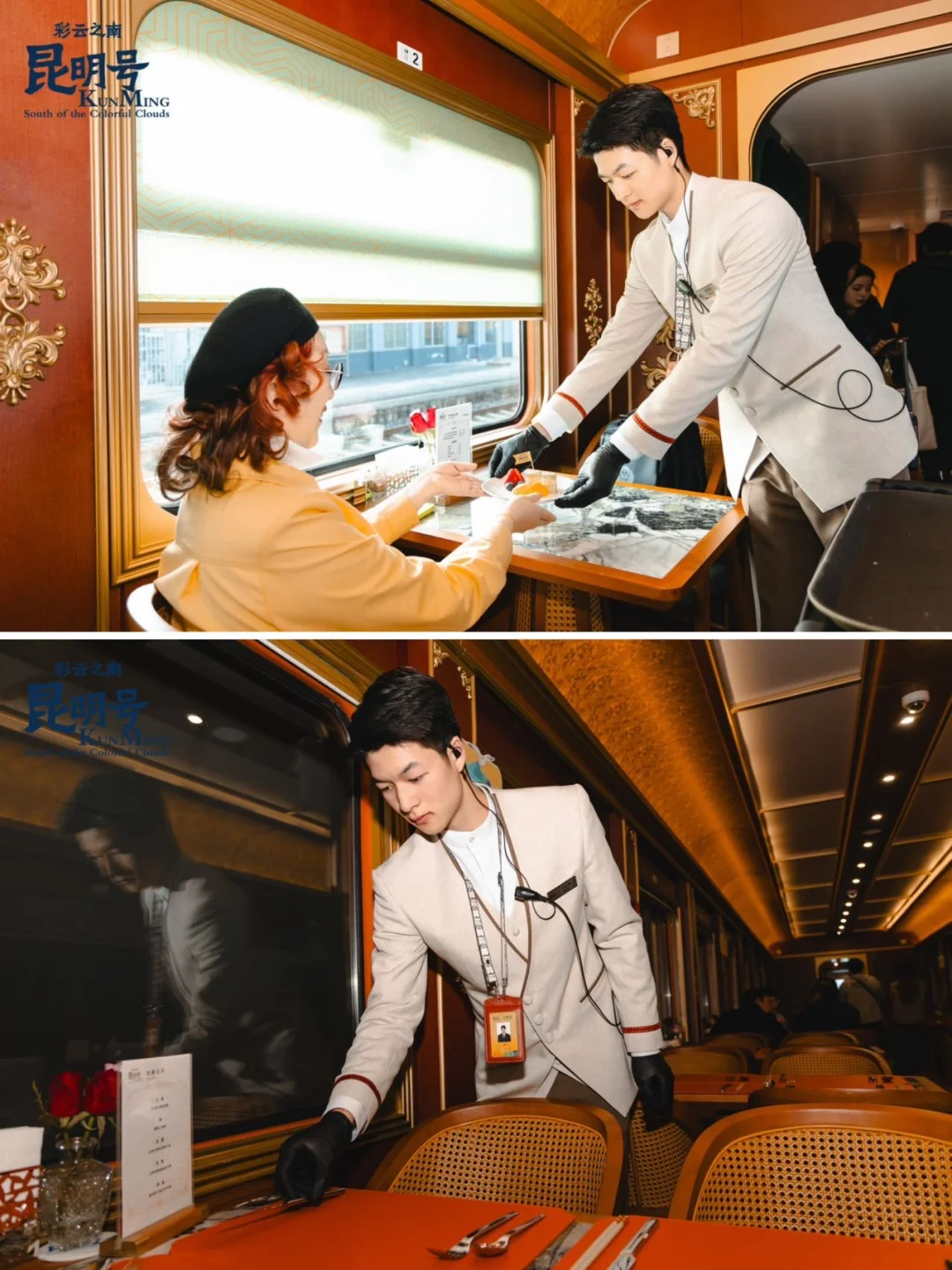 餐车布置得很有民族风情,木质桌椅配上蓝色扎染桌布。最惊喜的是,晚上常有少数民族表演,彝族姑娘唱着敬酒歌,佤族小伙跳着甩发舞,车厢里欢声笑语不断。