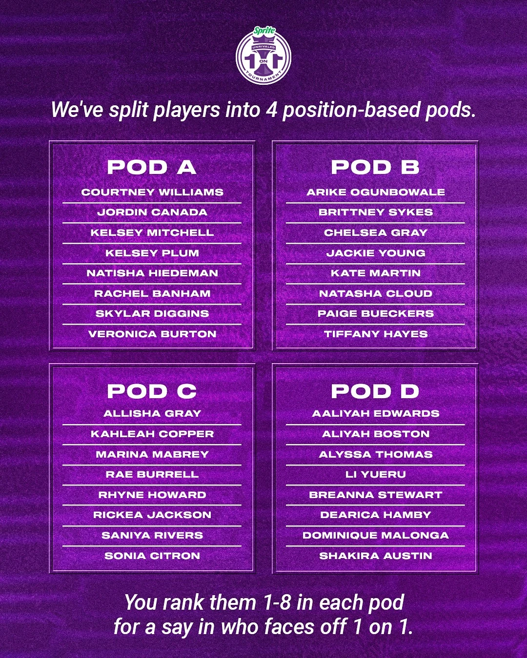 目前32名球员被分为4组,球迷可以对每个小组的球员进行投票,以确定单挑赛的种子选手。球迷投票将在美国东部时间3日上午10点开始,4日结束。7日将公布包含球迷、球员、教练、媒体投票的完整对阵表。
