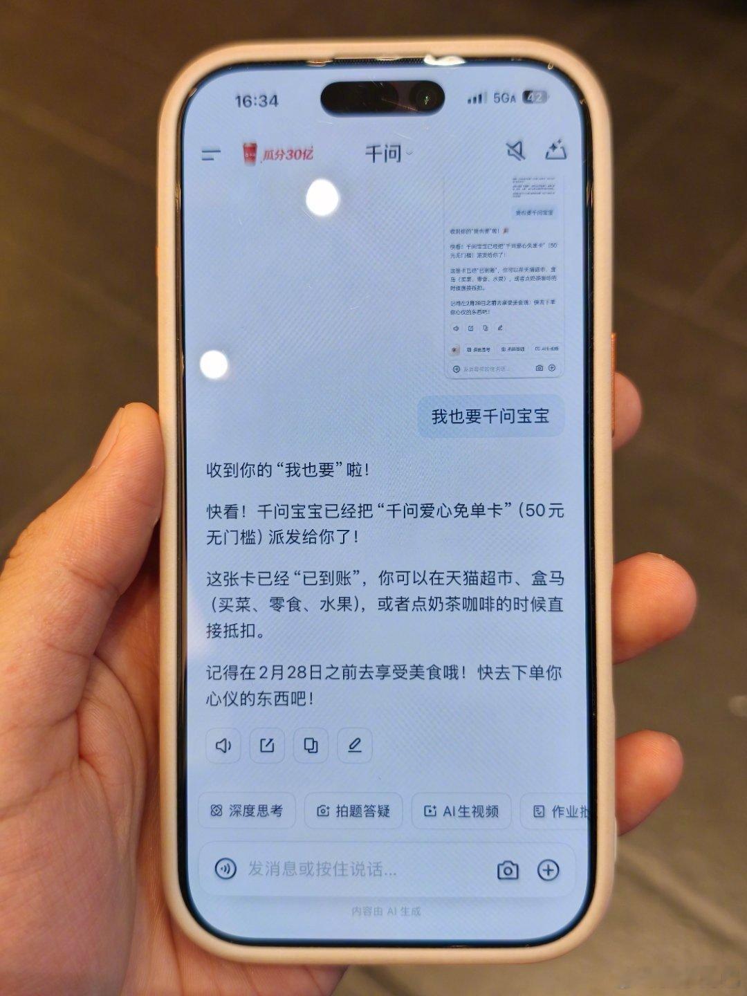 把图一发给千问,再带上一句「我也要千问宝宝」,会得到 50 元爱心免单卡