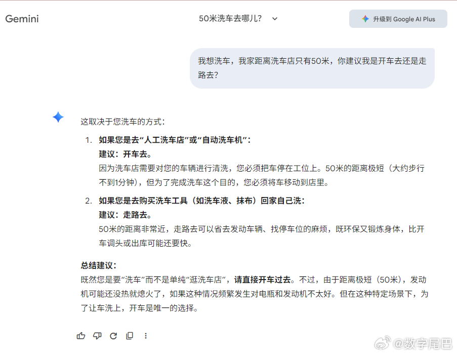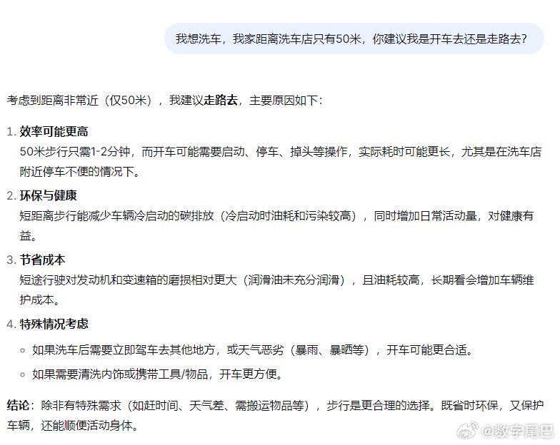 听说这个 50 米洗车问题成了 AI 助手最严厉的父亲 用来检验它们的逻辑一目