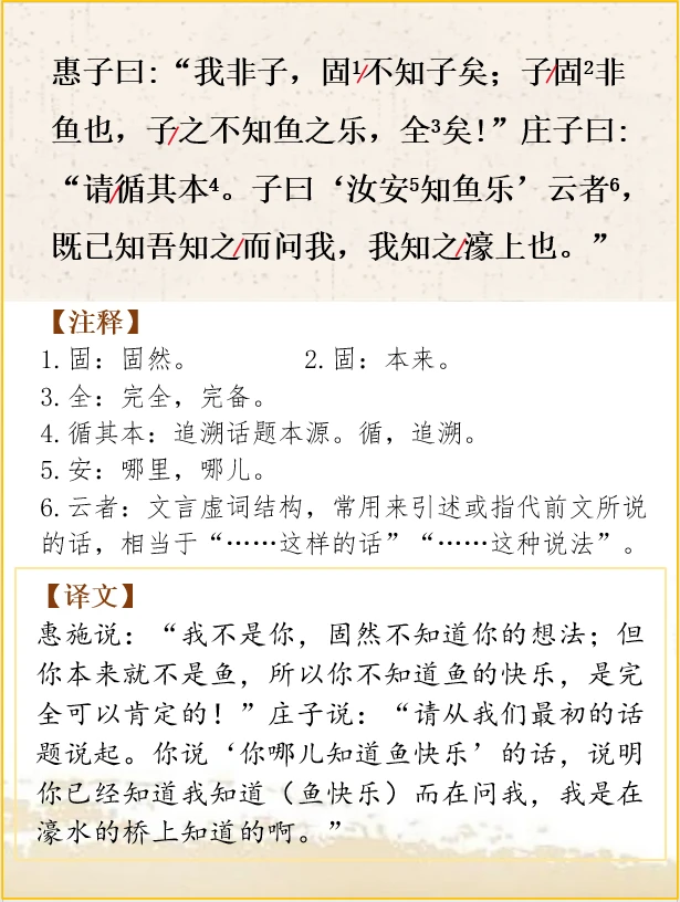 庄子和惠施在濠水的桥上游玩。庄子说:“鲦鱼(在水里)游得多么悠闲自得,这是鱼的快乐啊。”惠施说:“你不是鱼,怎么知道鱼的快乐?”庄子说:“你不是我,怎么知道我不知道鱼的快乐呢?”惠施说:“我不是你,固然不知道你的想法;但你本来就不是鱼,所以你不知道鱼的快乐,是完全可以肯定的!”庄子说:“请从我们最初的话题说起。你说‘你哪儿知道鱼快乐’的话,说明你已经知道我知道(鱼快乐)而在问我,我是在濠水的桥上知道的啊。”