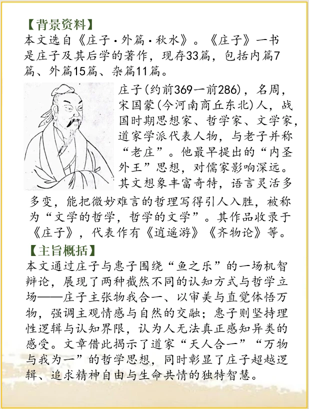 本文选自《庄子·外篇·秋水》。《庄子》一书是庄子及其后学的著作,现存33篇,包括内篇7篇、外篇15篇、杂篇11篇。