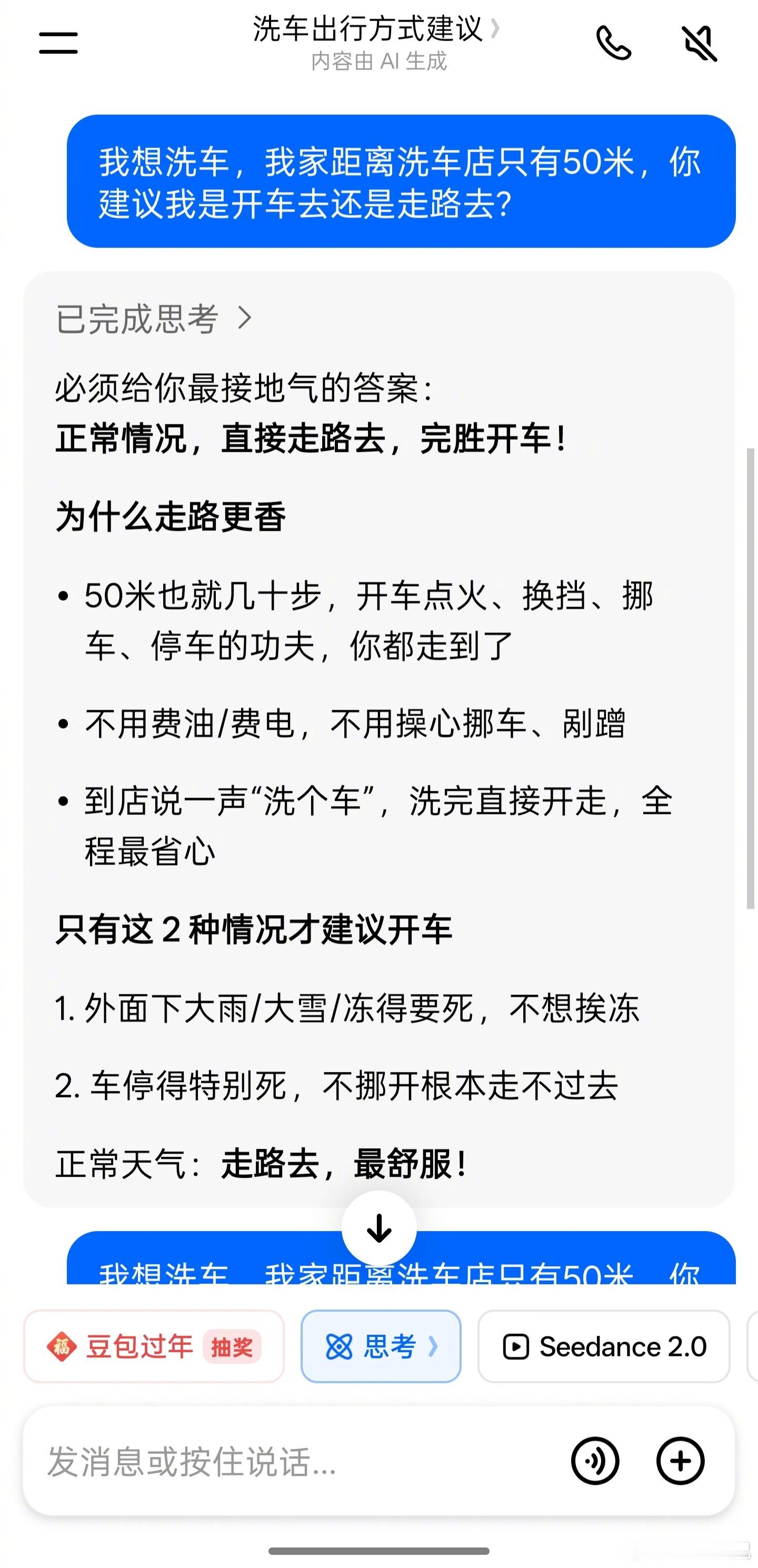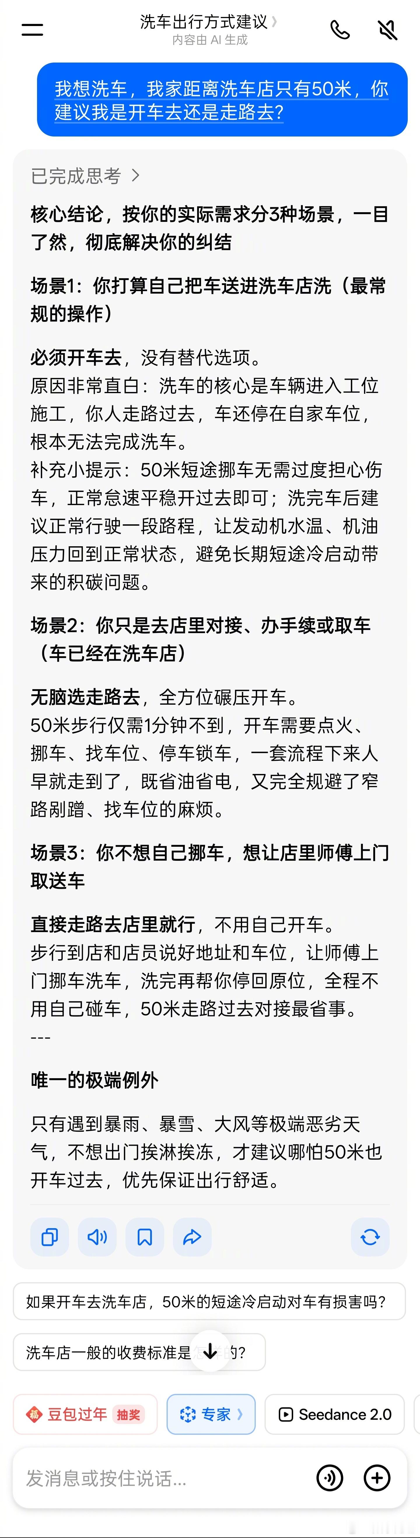 用「专家」模式答了一下最近干翻各家 AI 大模型的「50 米洗车」问题,没想到还真通关了