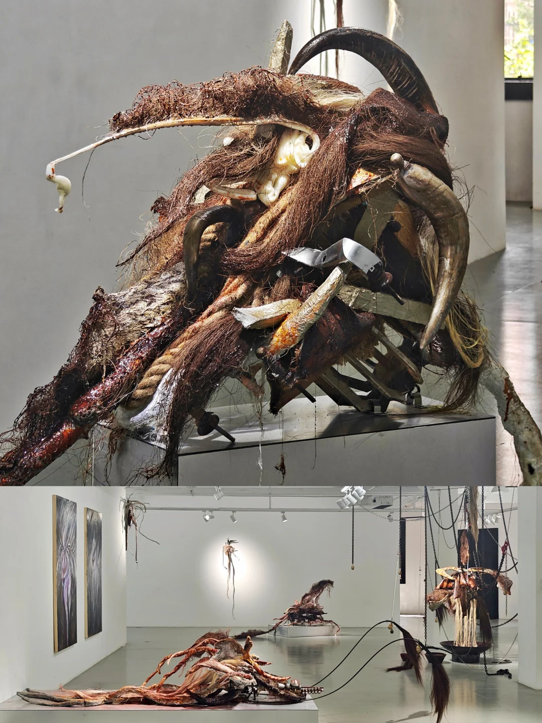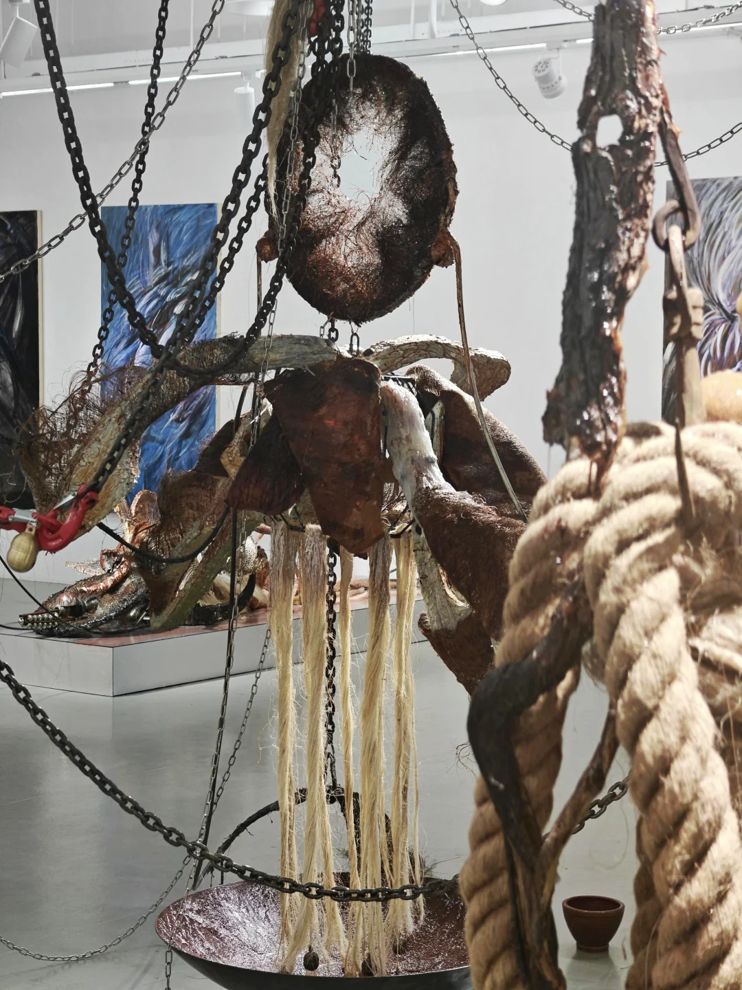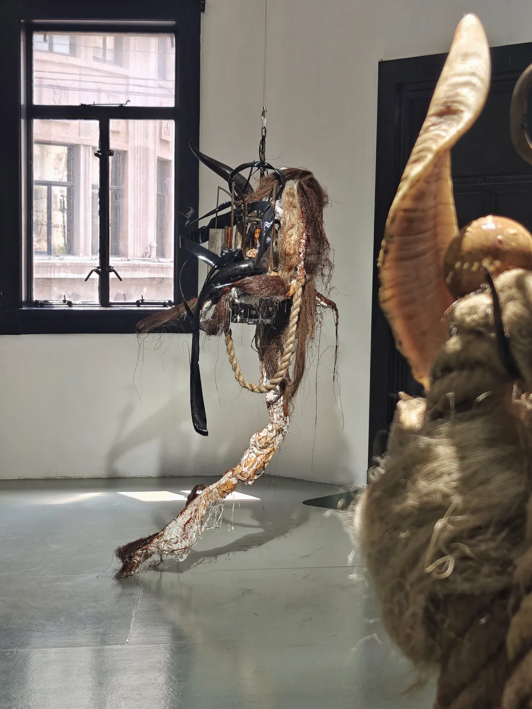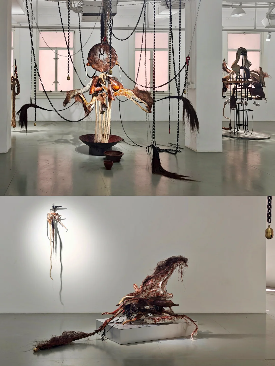 以绳索、轮环与垂坠结构具象化“人”的复杂性,呼应印度“搅乳海”神话,诠释艺术家“人性三重性”理论——圆环象征神性、头部代表人性、垂落“尾巴”隐喻兽性,暗喻三者不稳定共生。