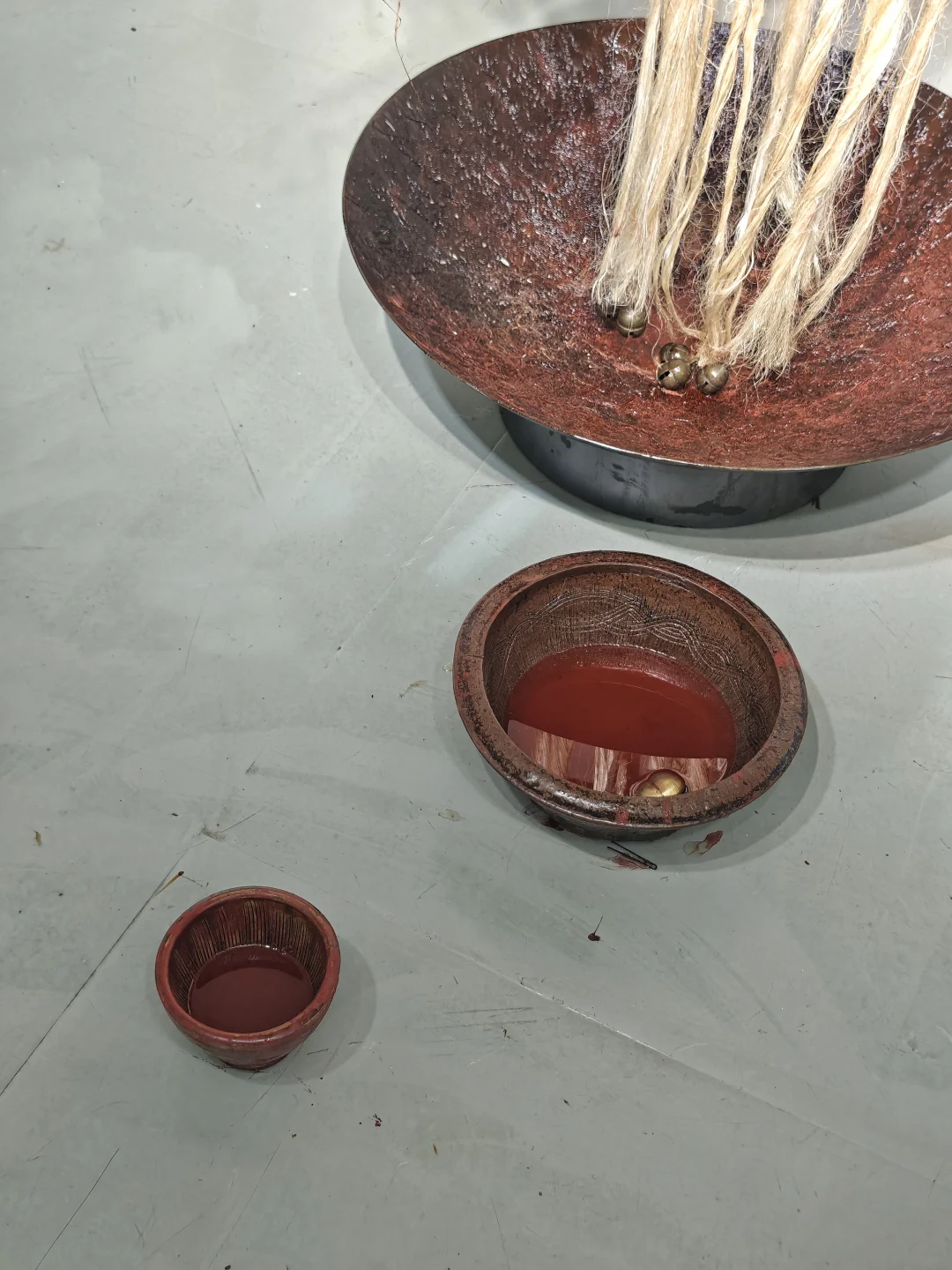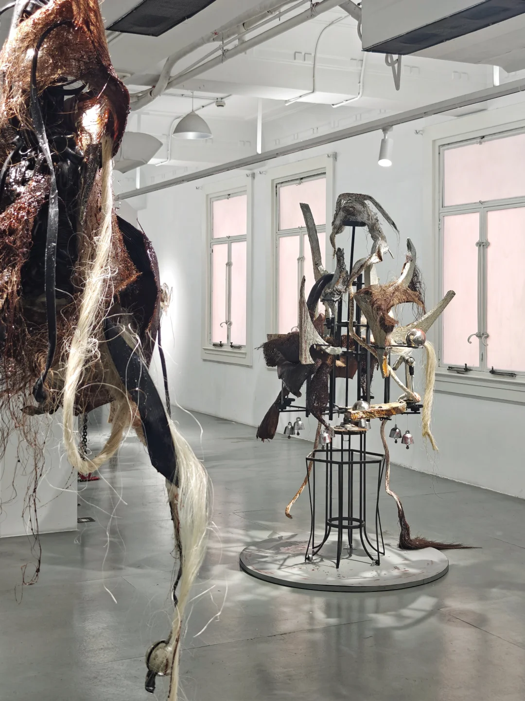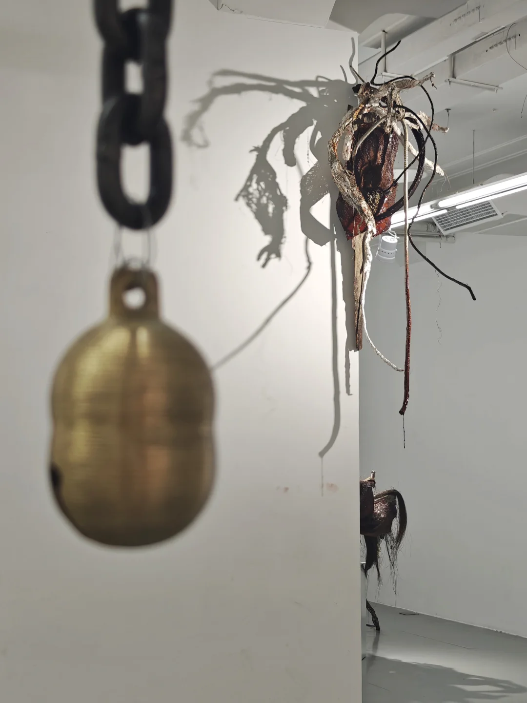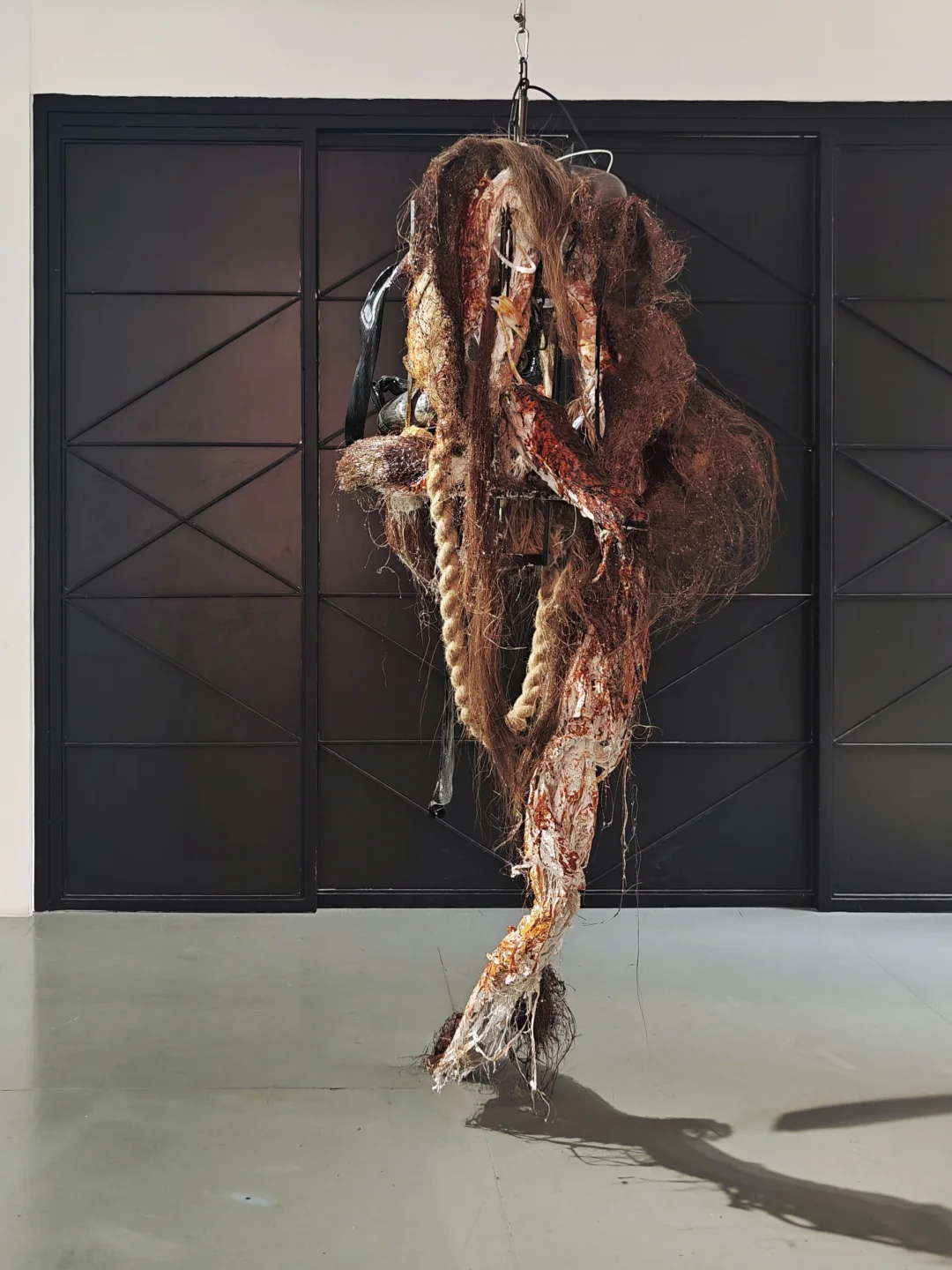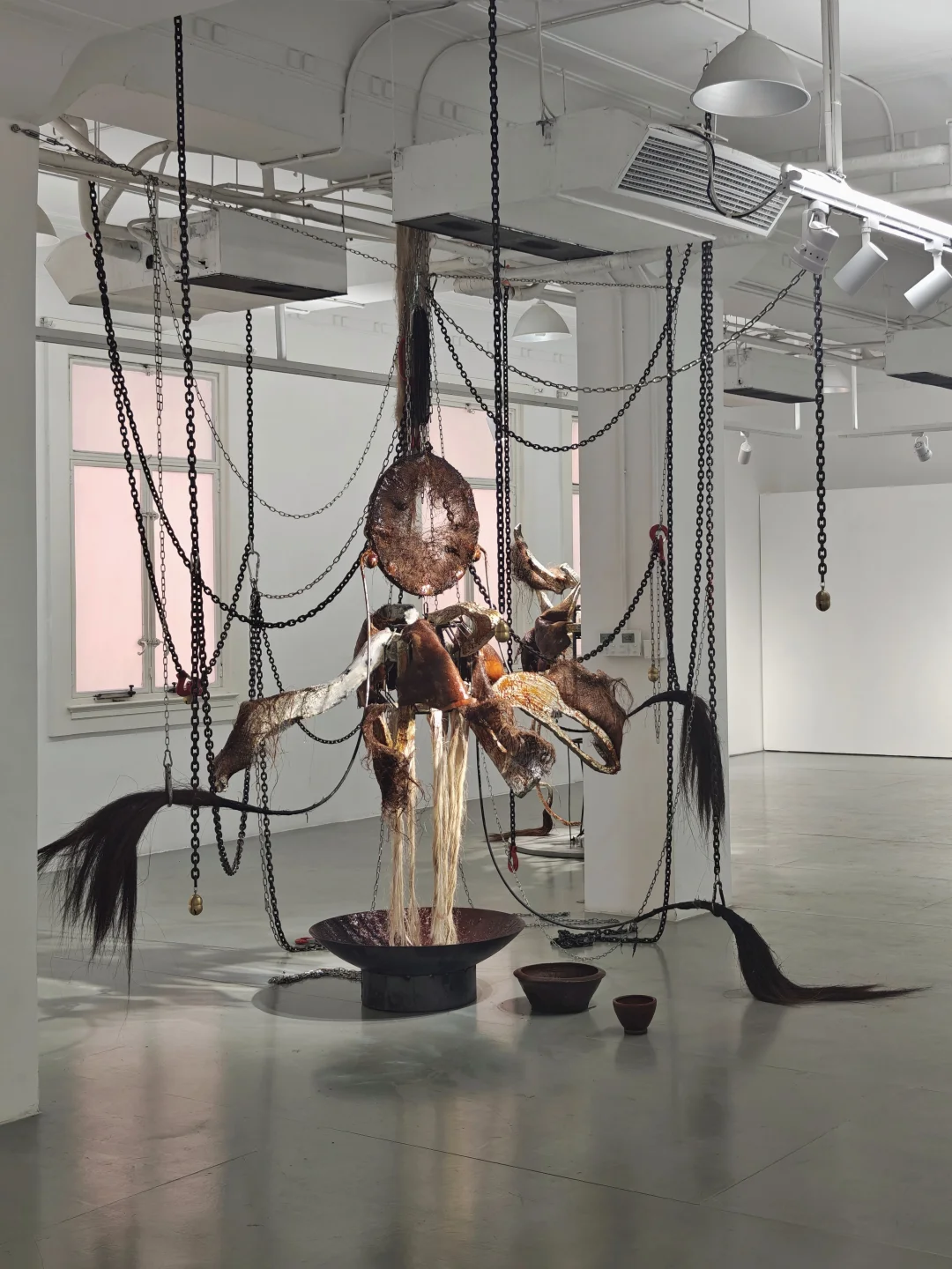以绳索、轮环与垂坠结构具象化“人”的复杂性,呼应印度“搅乳海”神话,诠释艺术家“人性三重性”理论——圆环象征神性、头部代表人性、垂落“尾巴”隐喻兽性,暗喻三者不稳定共生。