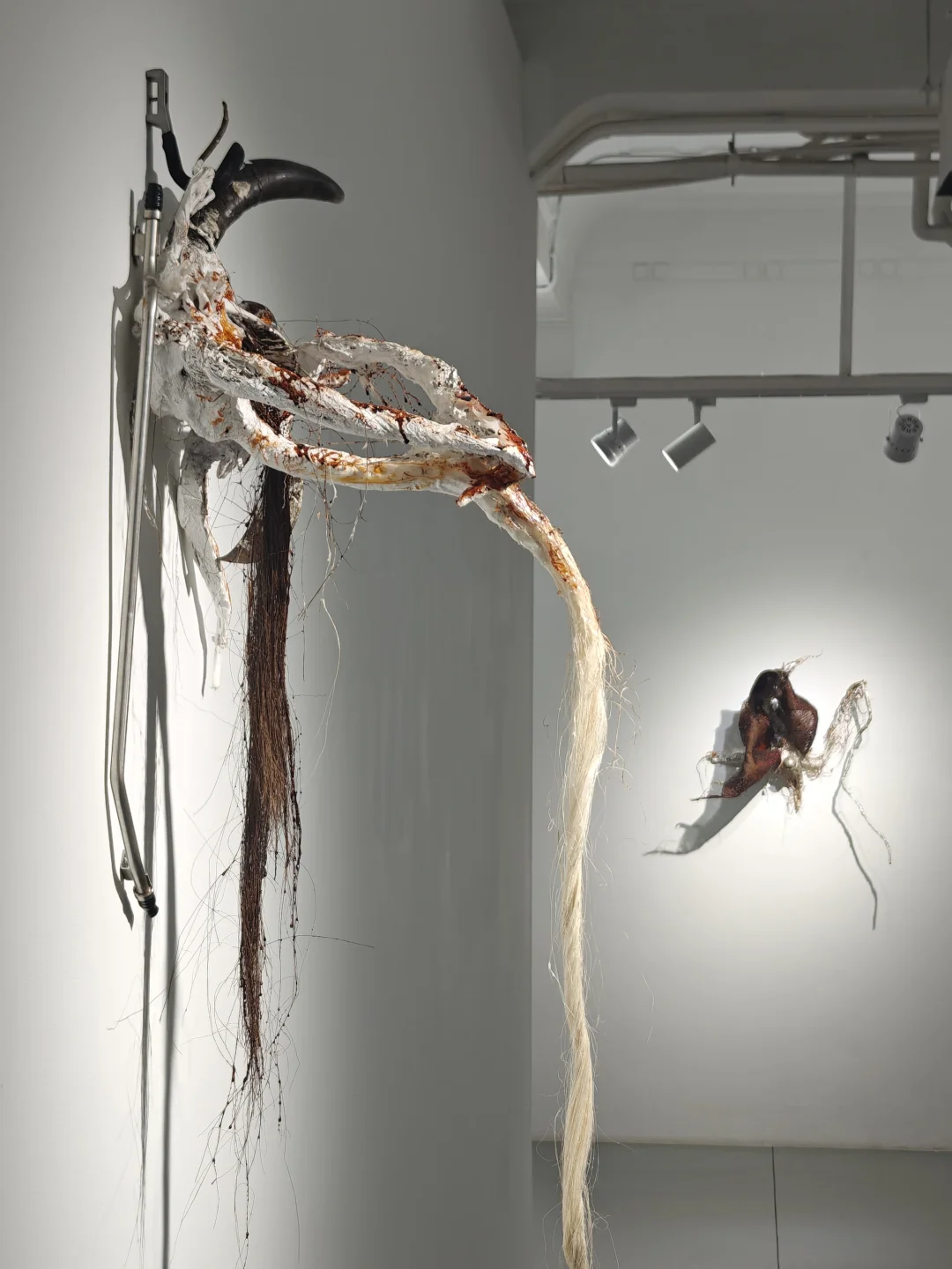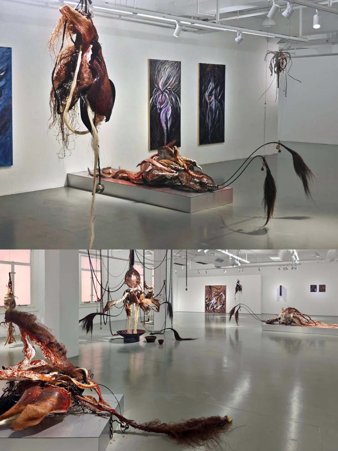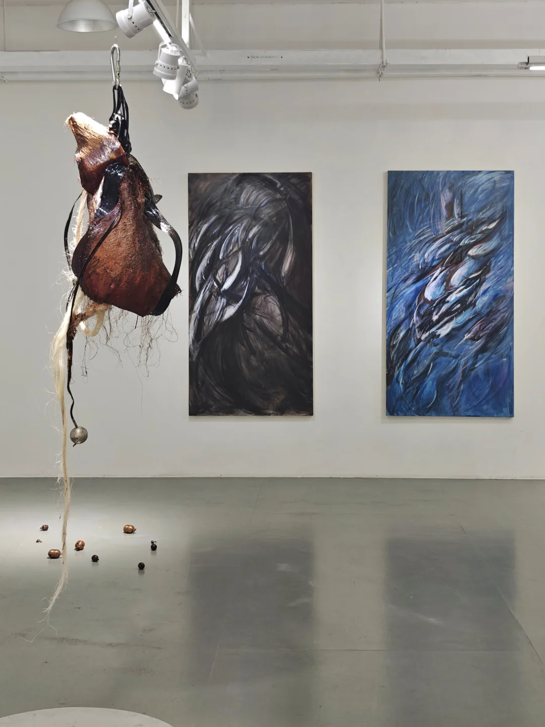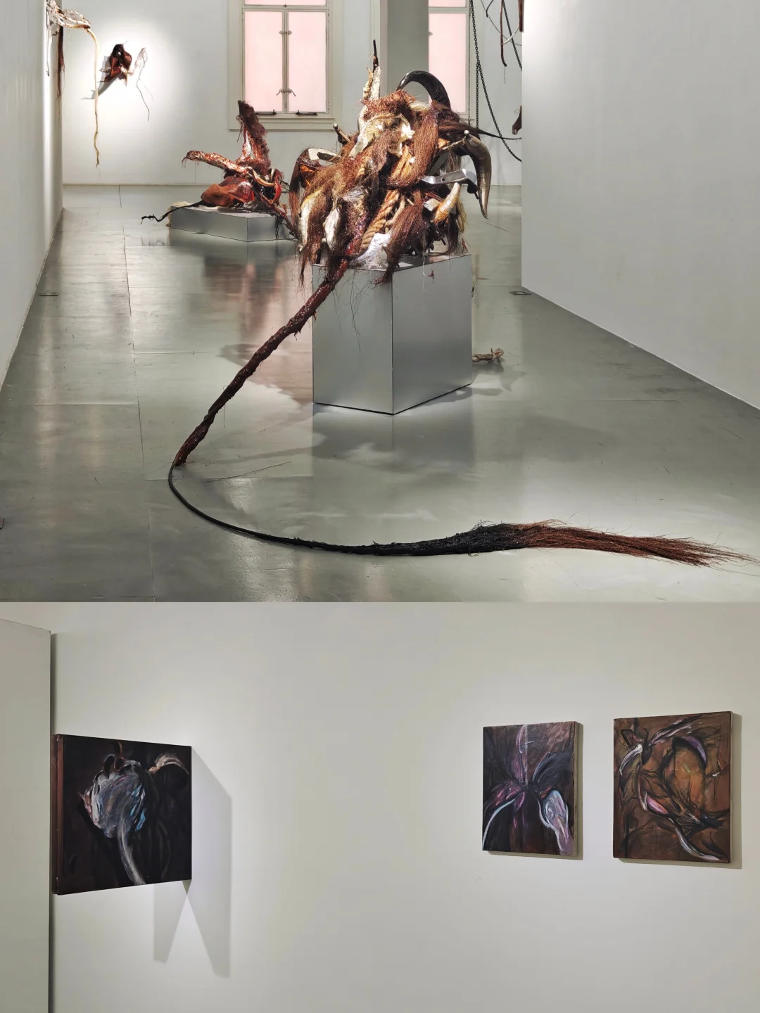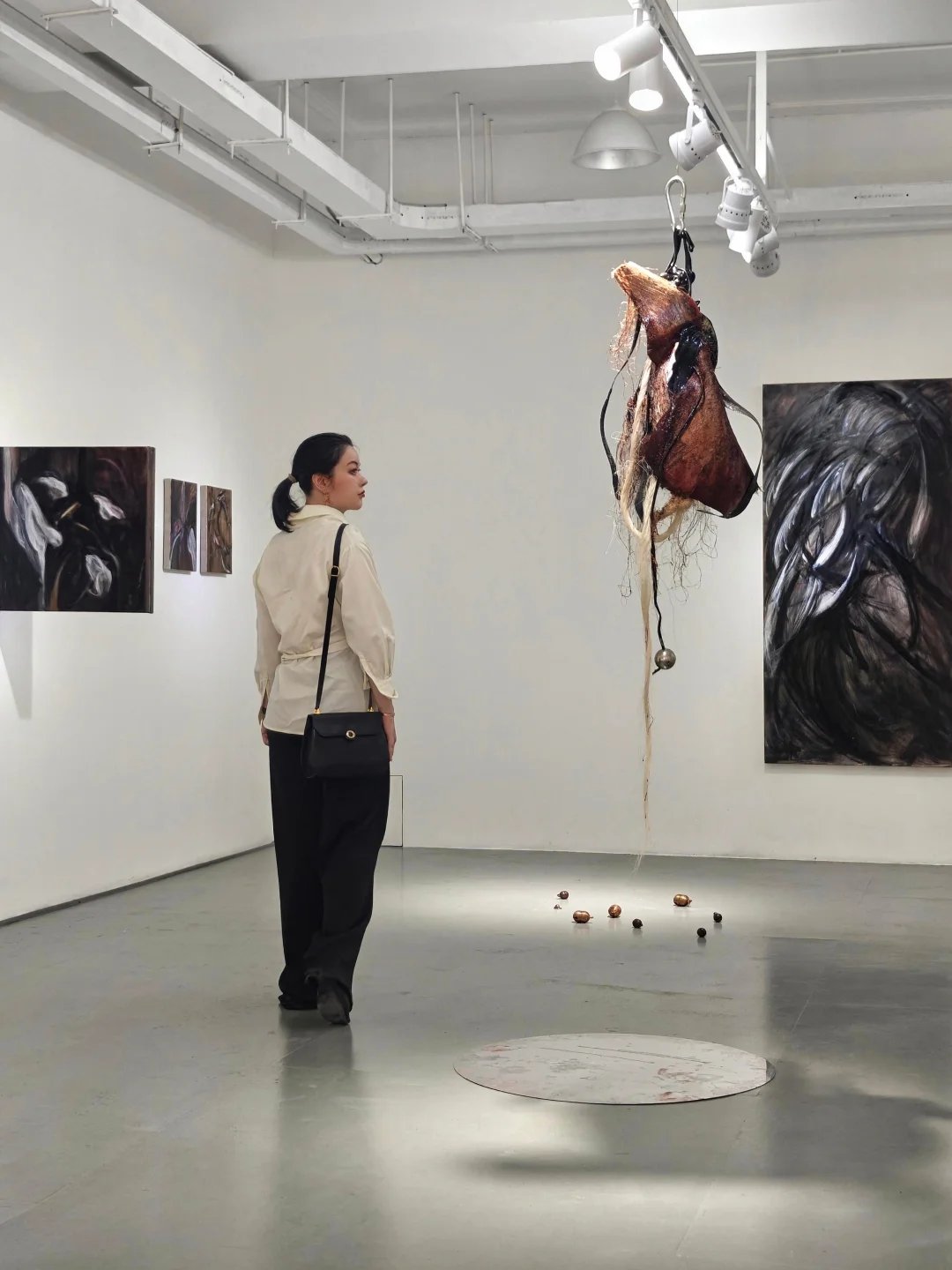 背后四幅《ACT 1/2/3/4》绘画扩展“人性三重性”探讨,装置与画作融合,表达对被压抑“兽性”的接纳。