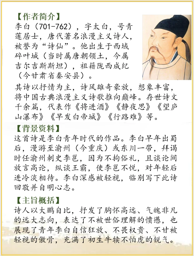 诗人以大鹏自比,抒发了胸怀高远、气魄非凡的远大志向,表达了不被世俗理解的愤懑,也展现了青年李白自信狂放、不畏权贵、不甘被轻视的傲骨,充满了初生牛犊不怕虎的锐气。