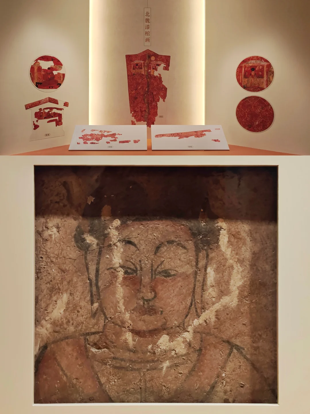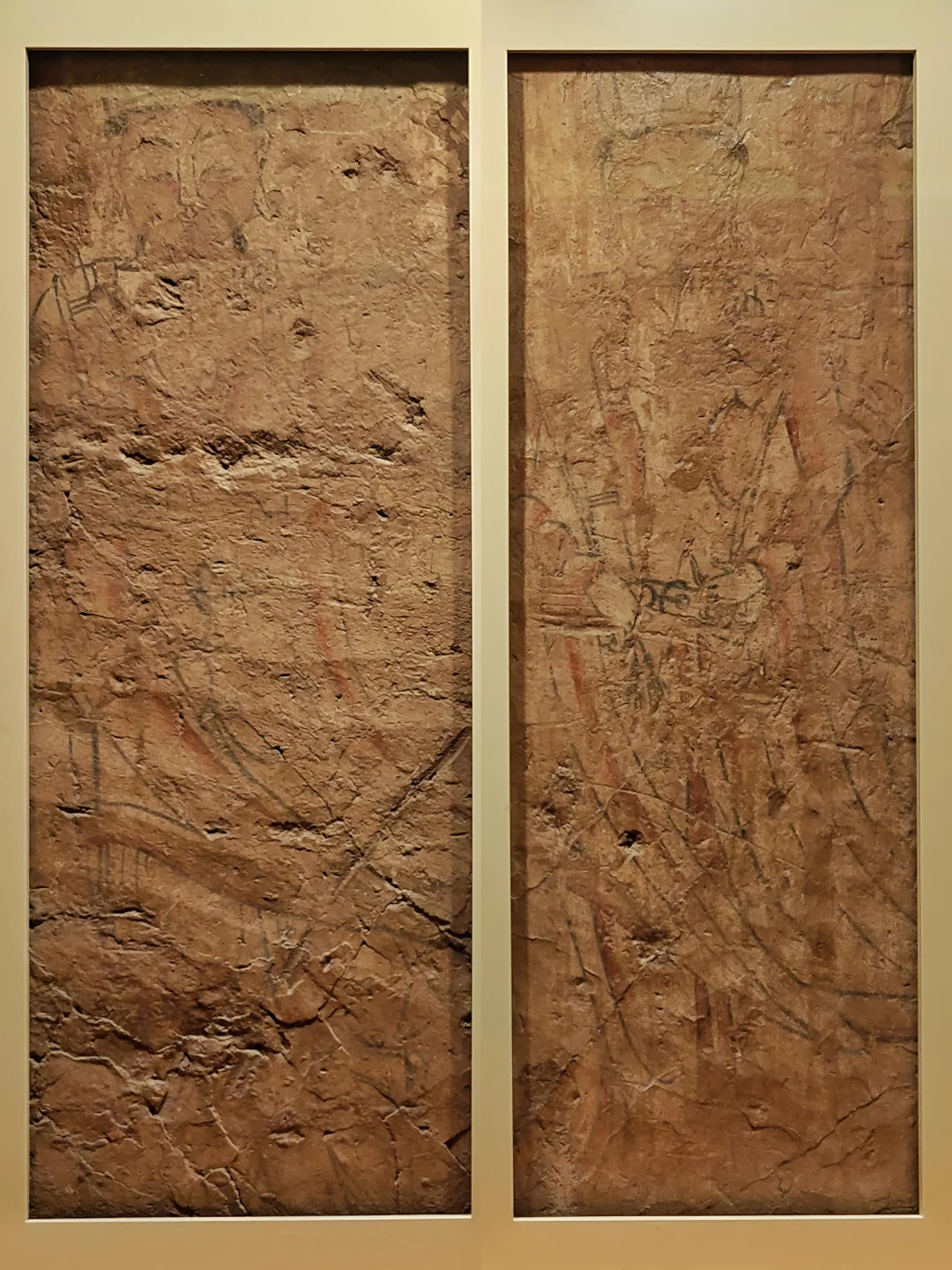 墓道、过洞、天井、甬道、墓室等处皆绘有壁画,人物基本与真人等大(过洞处因本身尺寸原因,尺寸较小),营造出外有武士值守、内有仆从服侍,墓主夫妇“观赏”伎乐舞蹈的欢乐景象,由此可见隋唐墓葬壁画的渊源。可惜因被盗与进水,壁画保存状况并不好。
