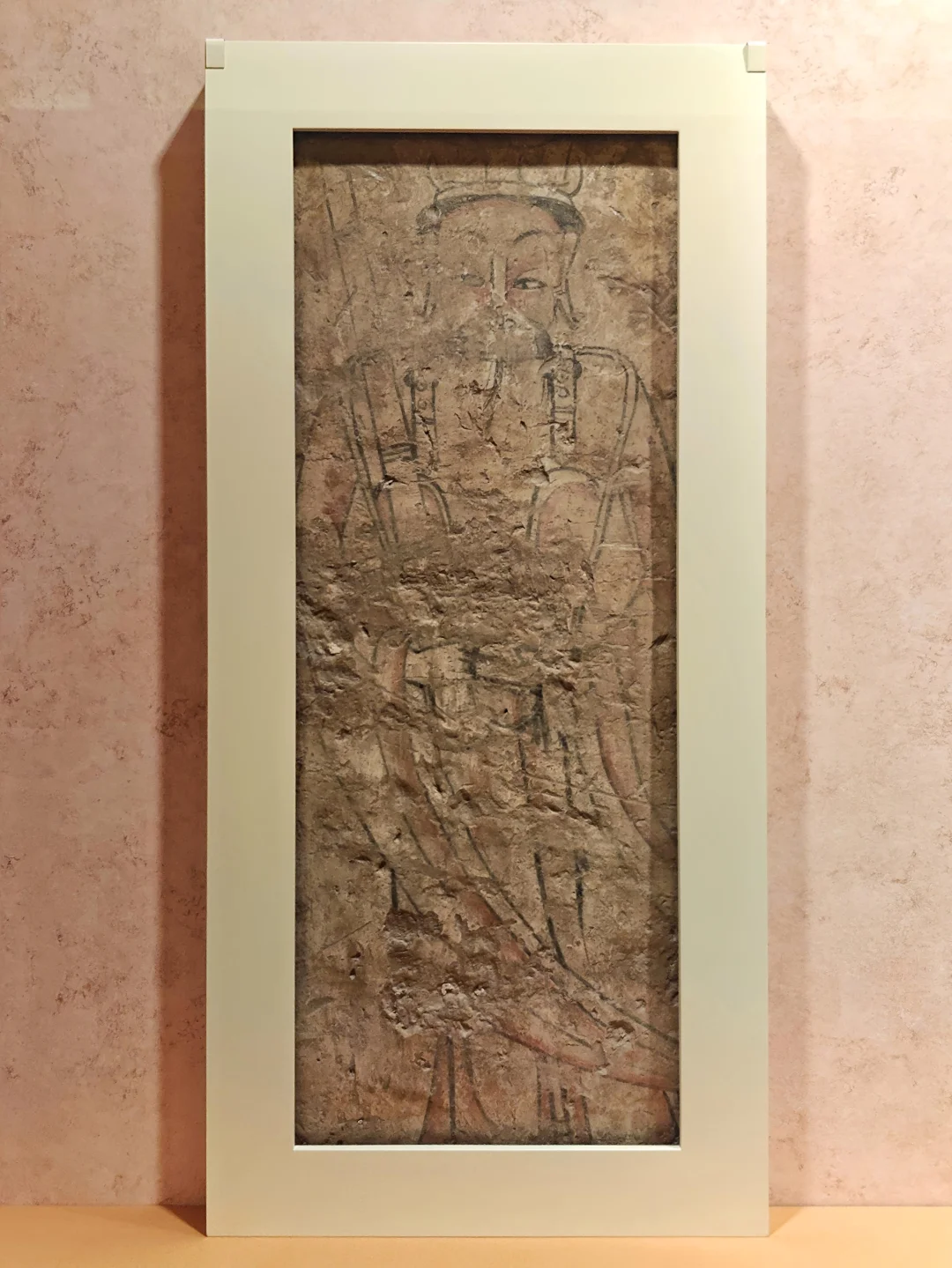 线条粗细均匀,为来自西域的“铁线描”技法。施色实用了在西魏、北周时期的敦煌石窟壁画中普遍使用的晕染法(包括时称“凹凸法”的西域晕染法和中原传统晕染法),塑造出五官的深邃感和面部的立体度、服饰的厚度和盔甲的凸起。