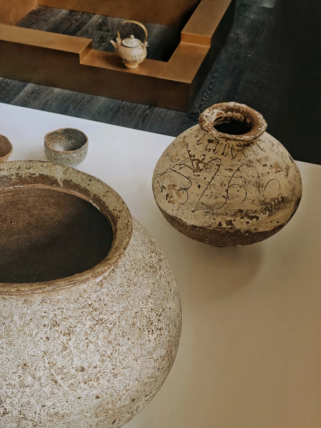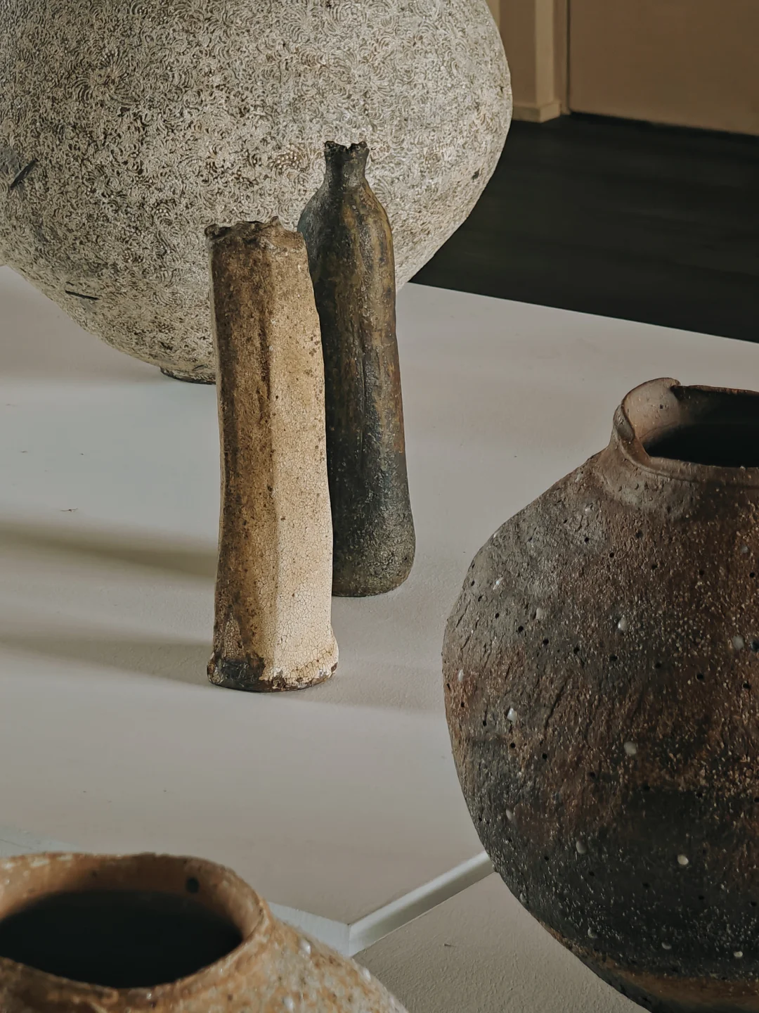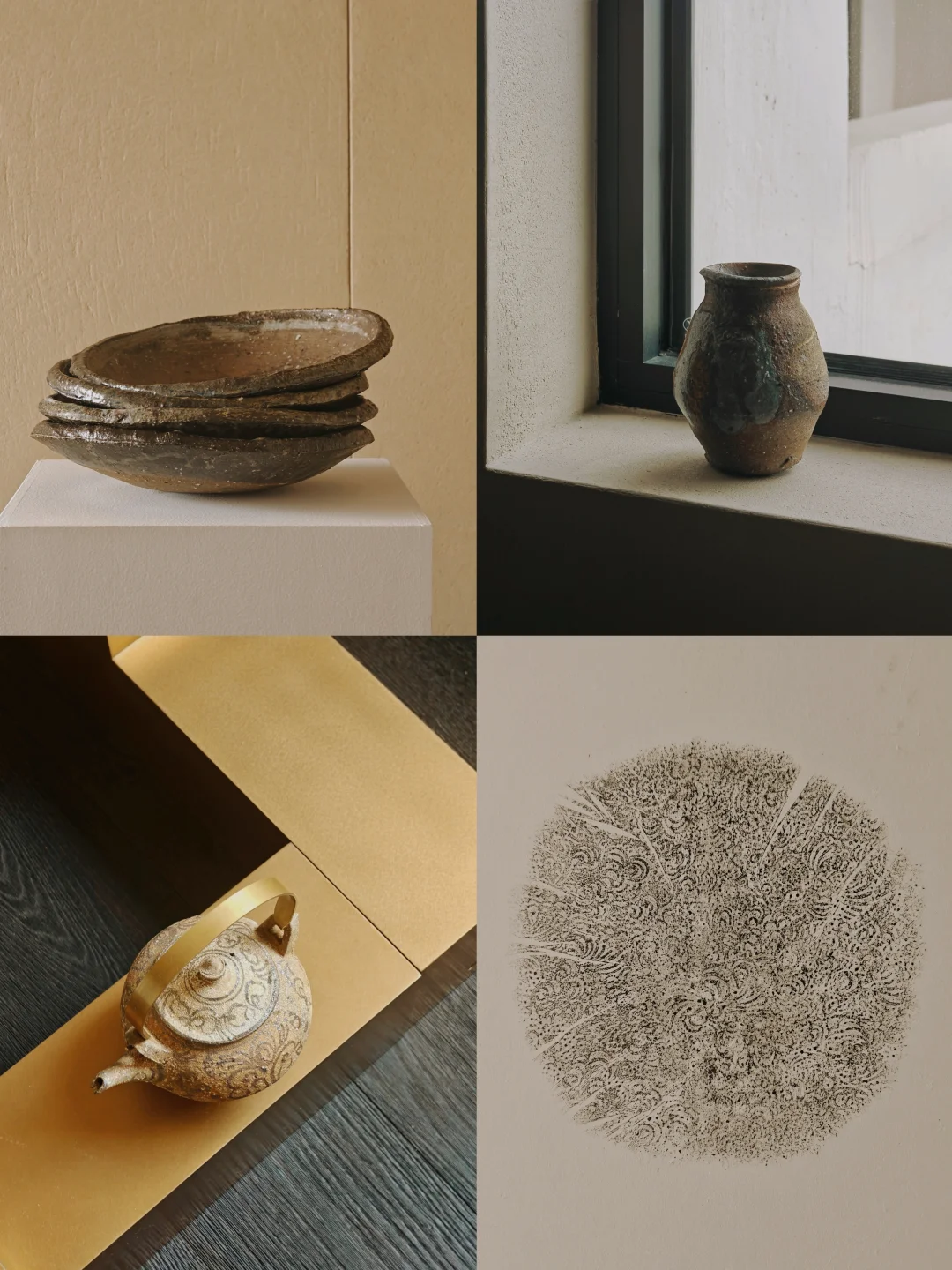?作品以“壶(tsubo)”为核心,介于日用器与雕塑之间,融入地、水、火、风元素,纹样多无意识自然涌现,兼具细腻感与力量感,如火山喷发后平静却有痕跡