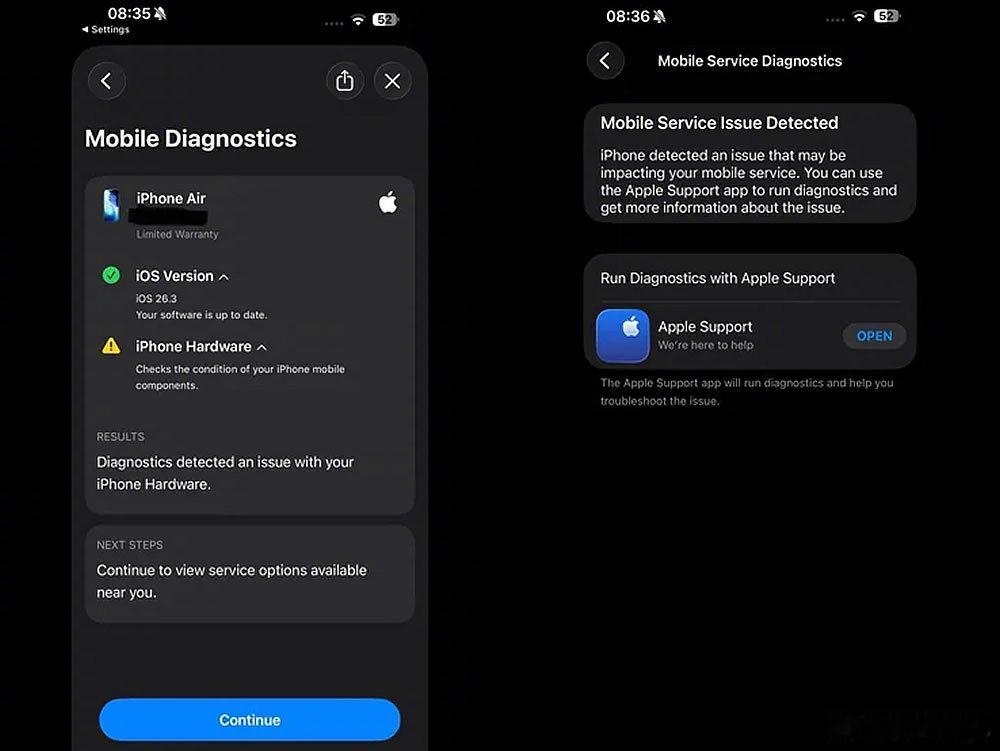 用户声称 iPhone Air 一直都是带壳使用,没有摔过,一觉醒来之后就发现完全没有移动网络服务。