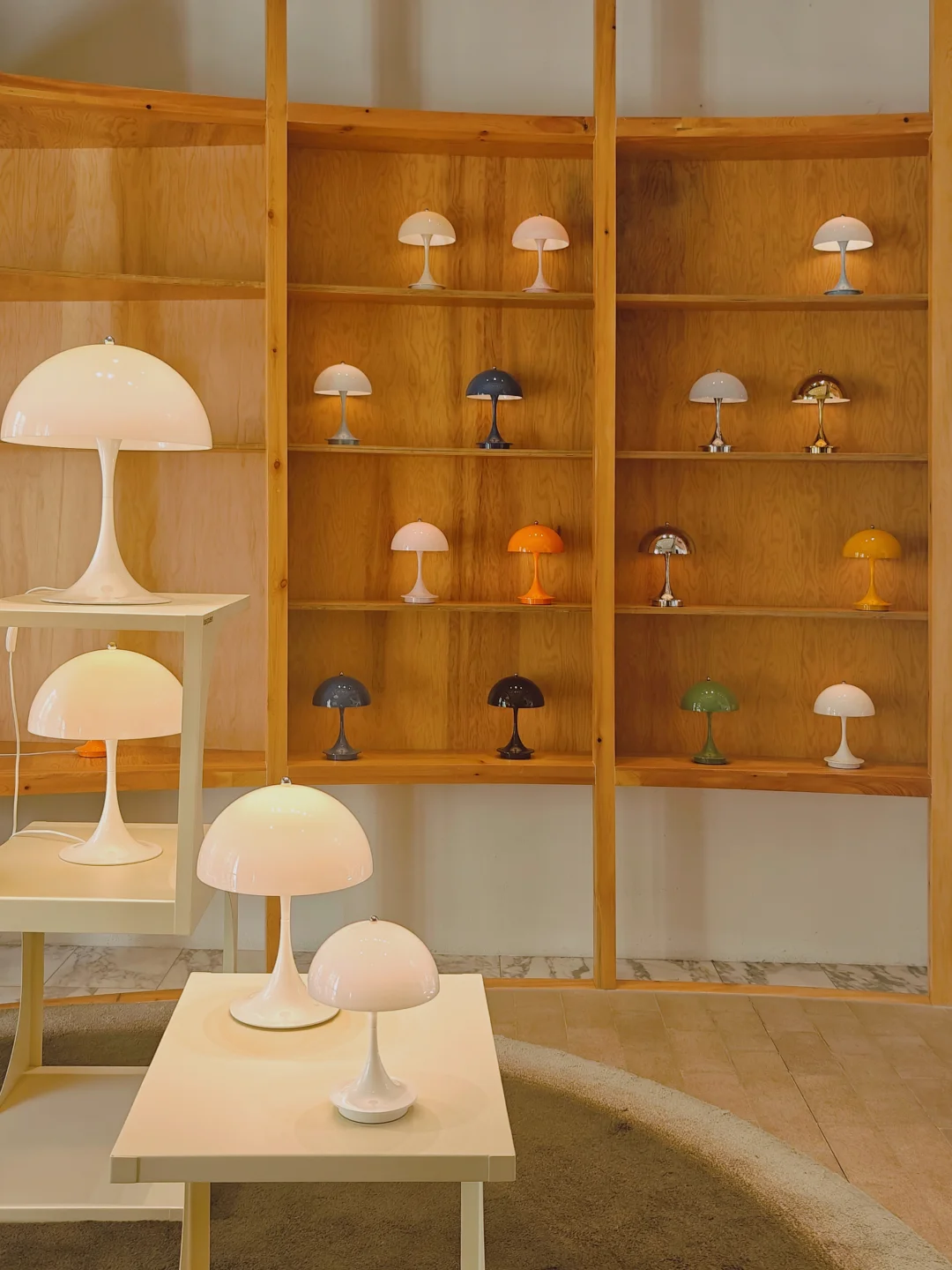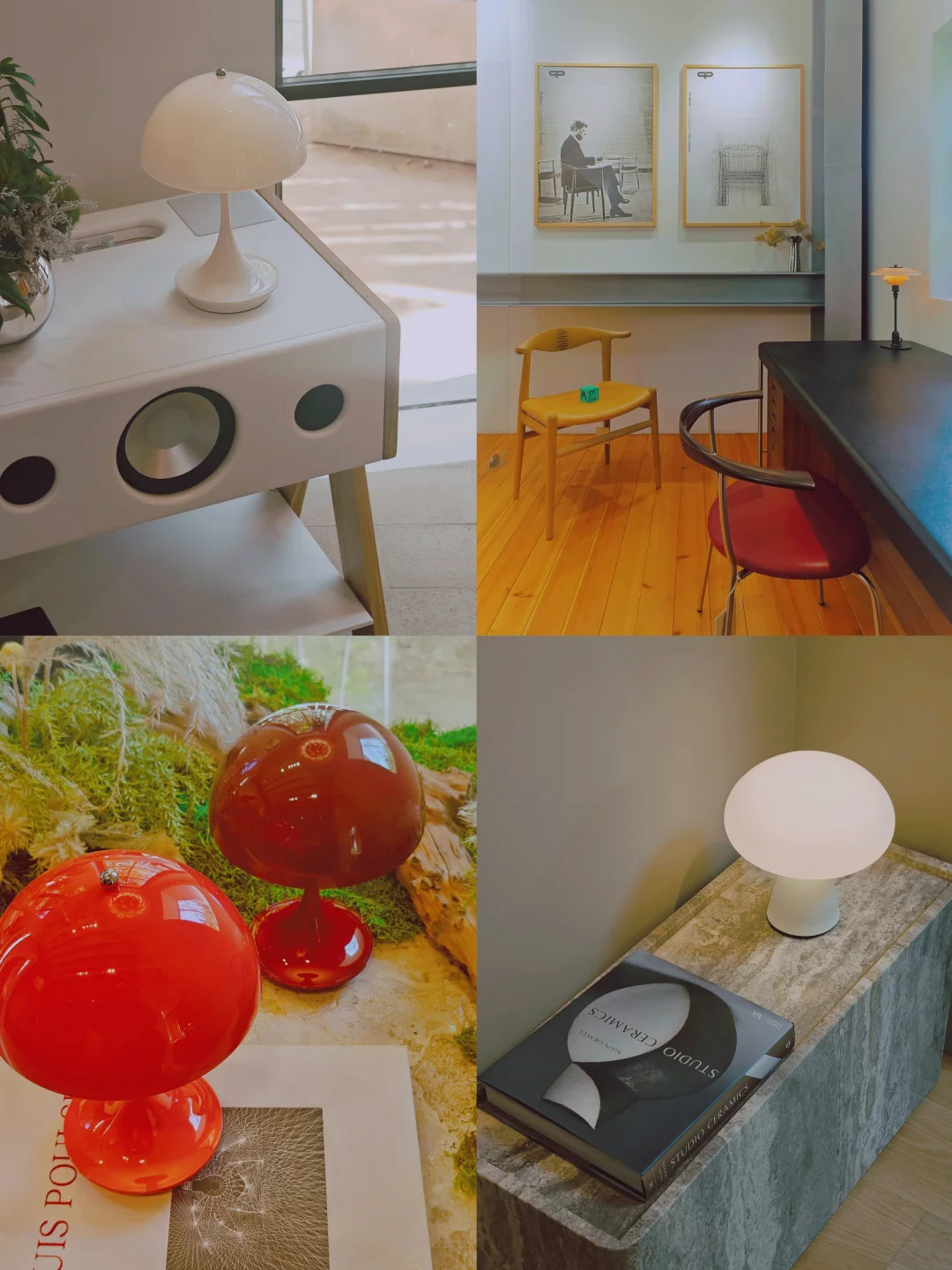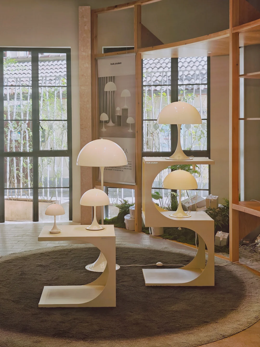 Verner Panton于1971年为Louis Poulsen设计的经典灯具系列,造型模仿蘑菇,采用透光性良好的蛋白石丙烯酸等材质制作灯罩,半球形的顶部灯罩将光线向下引导,由喇叭形底座反射,从而产生柔和、扩散且无眩光的光线,营造出舒适的照明氛围。它不仅是一个灯具,更是一件可以独立存在于房间中的雕塑作品,体现了功能与形式的完美结合。