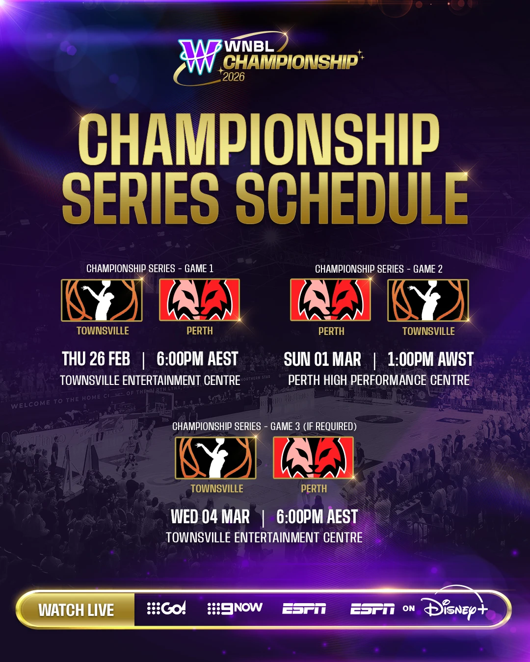 随后,WNBL官方也给出三局两胜制总决赛的具体场次时间——