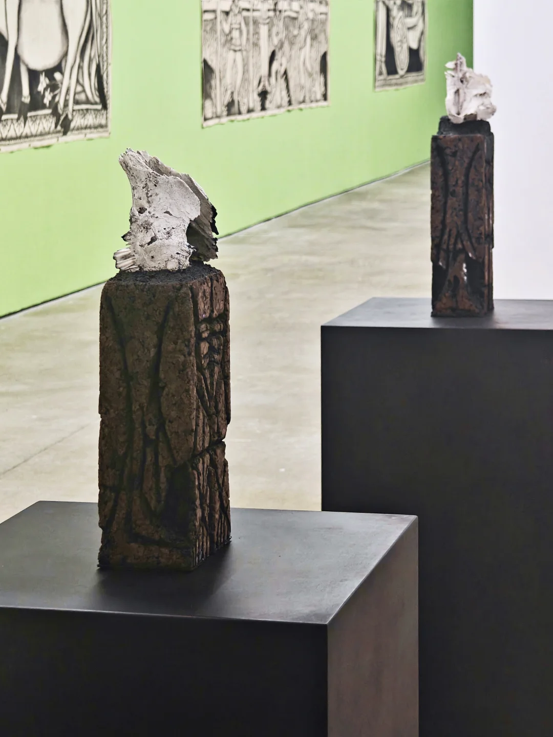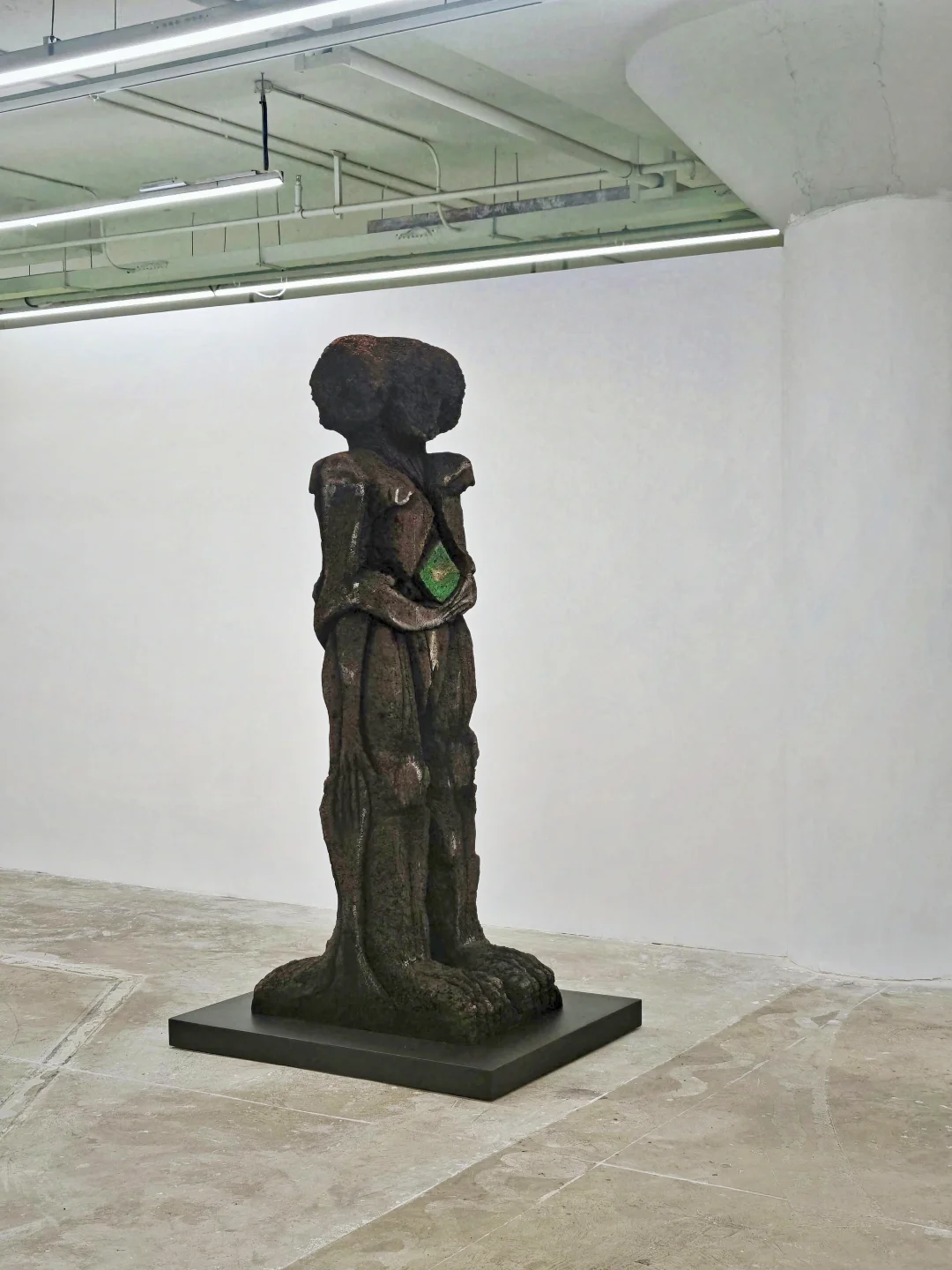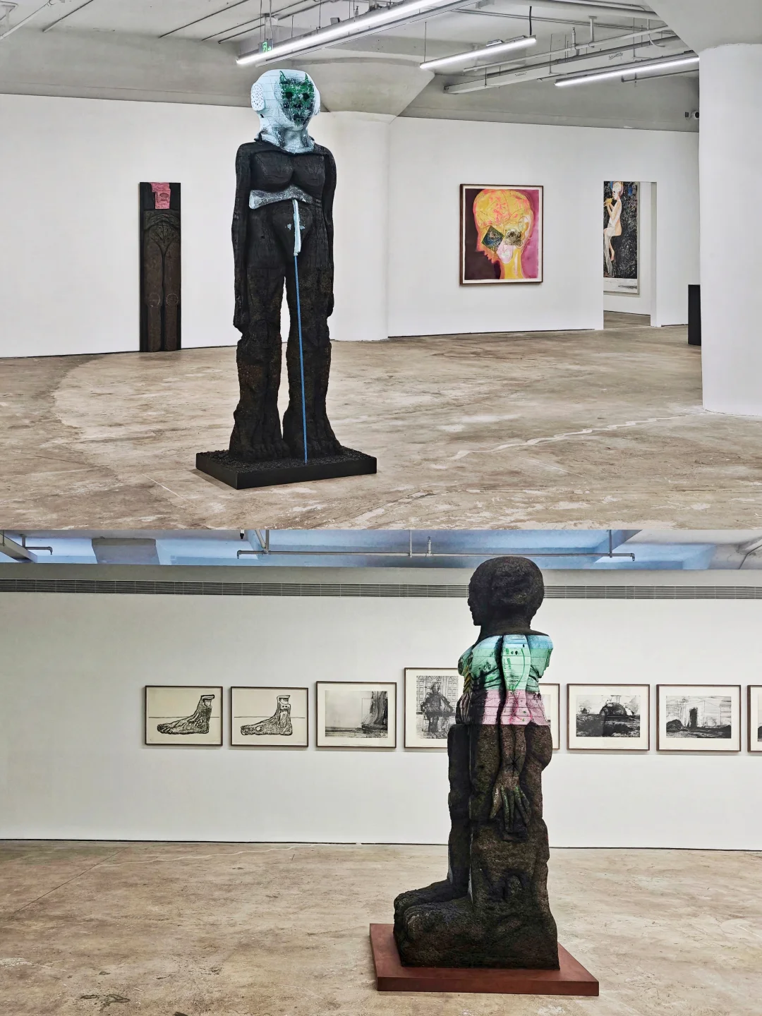 用软木、泡沫塑料、青铜等创作拟人雕塑,融合科幻、古罗马遗迹与战后抽象元素,将人体化为怪诞图腾,不安感中又藏着黑色幽默,以手工肌理串联远古、当代与未来,传递强烈情感张力。