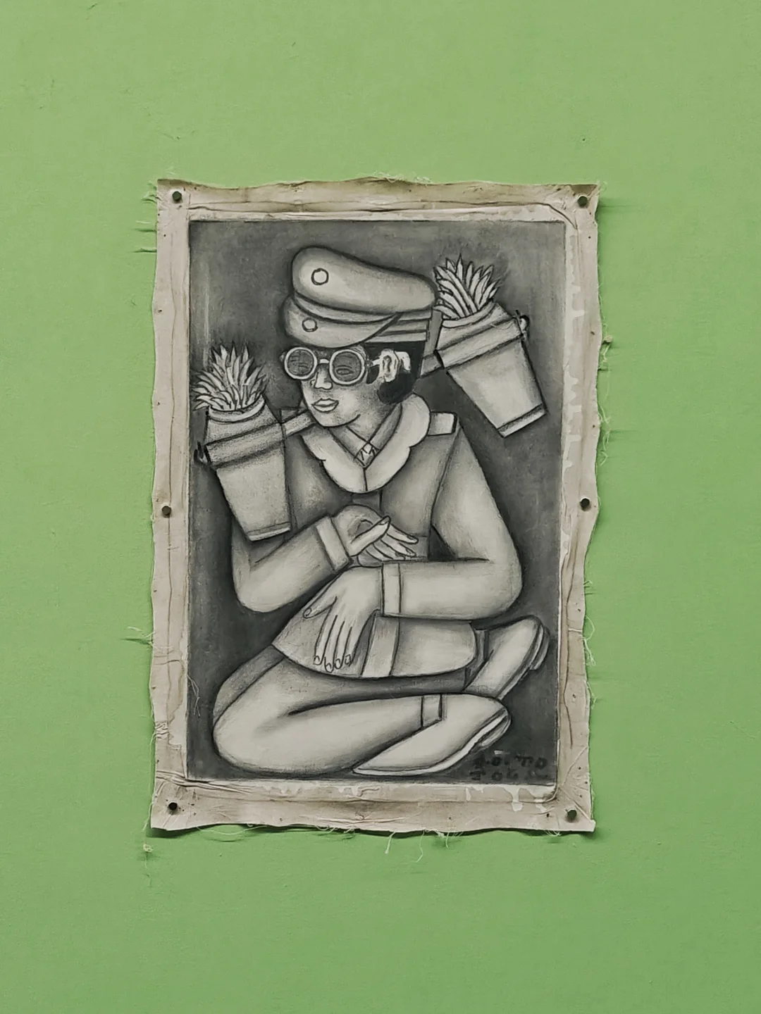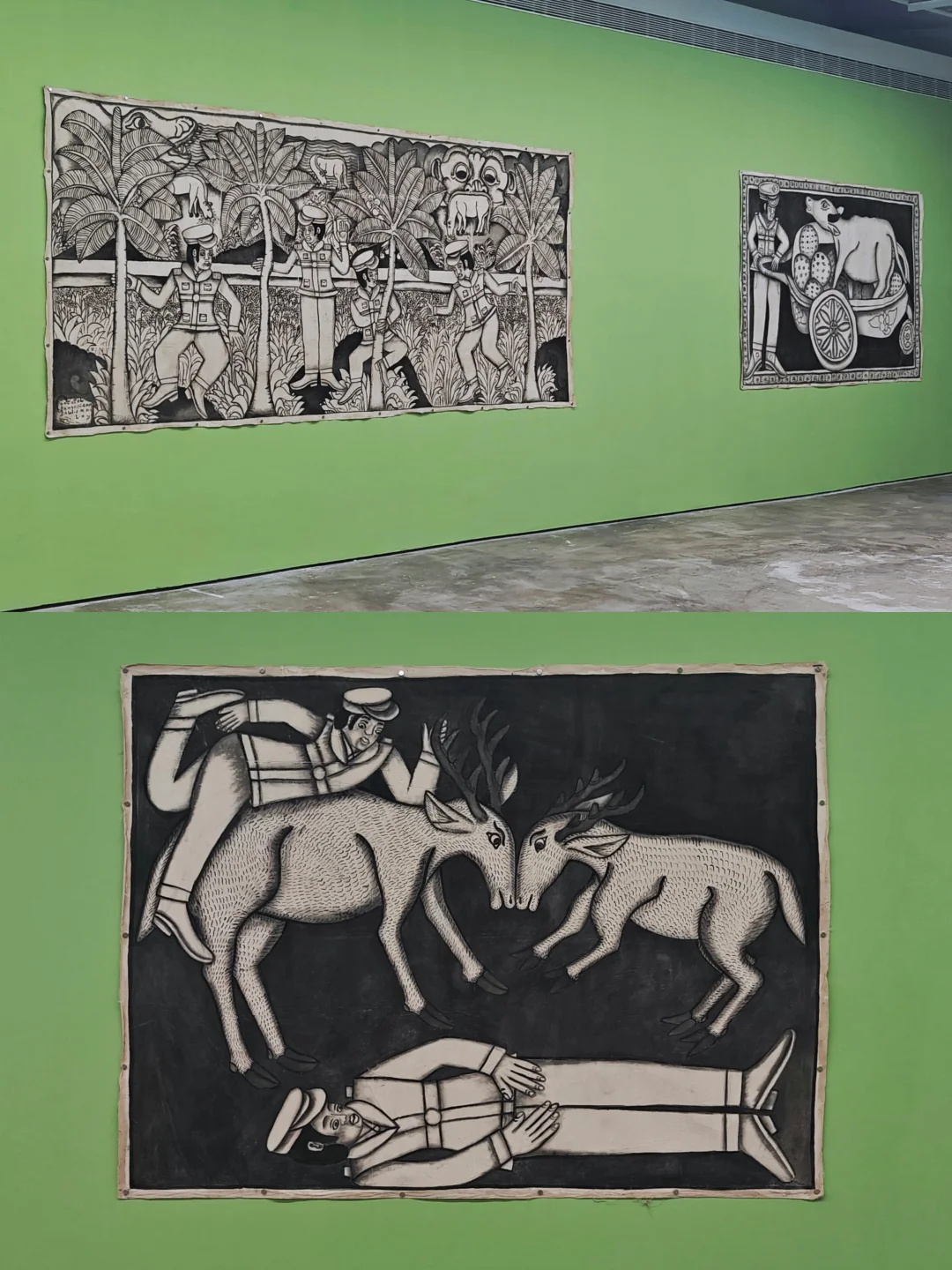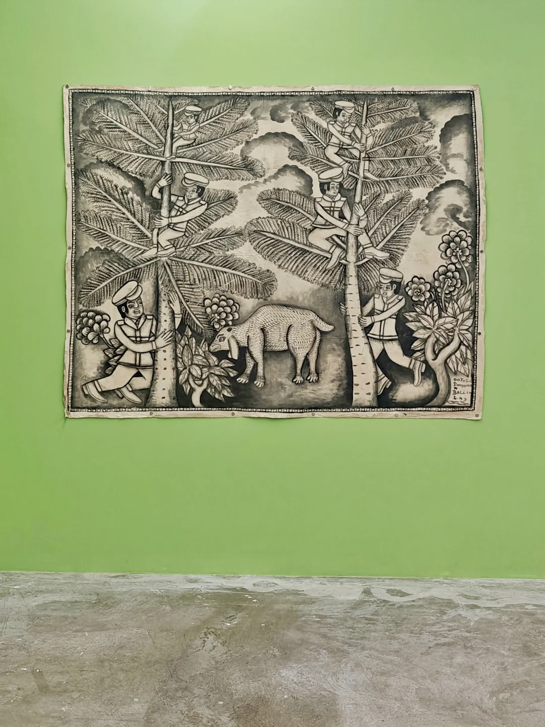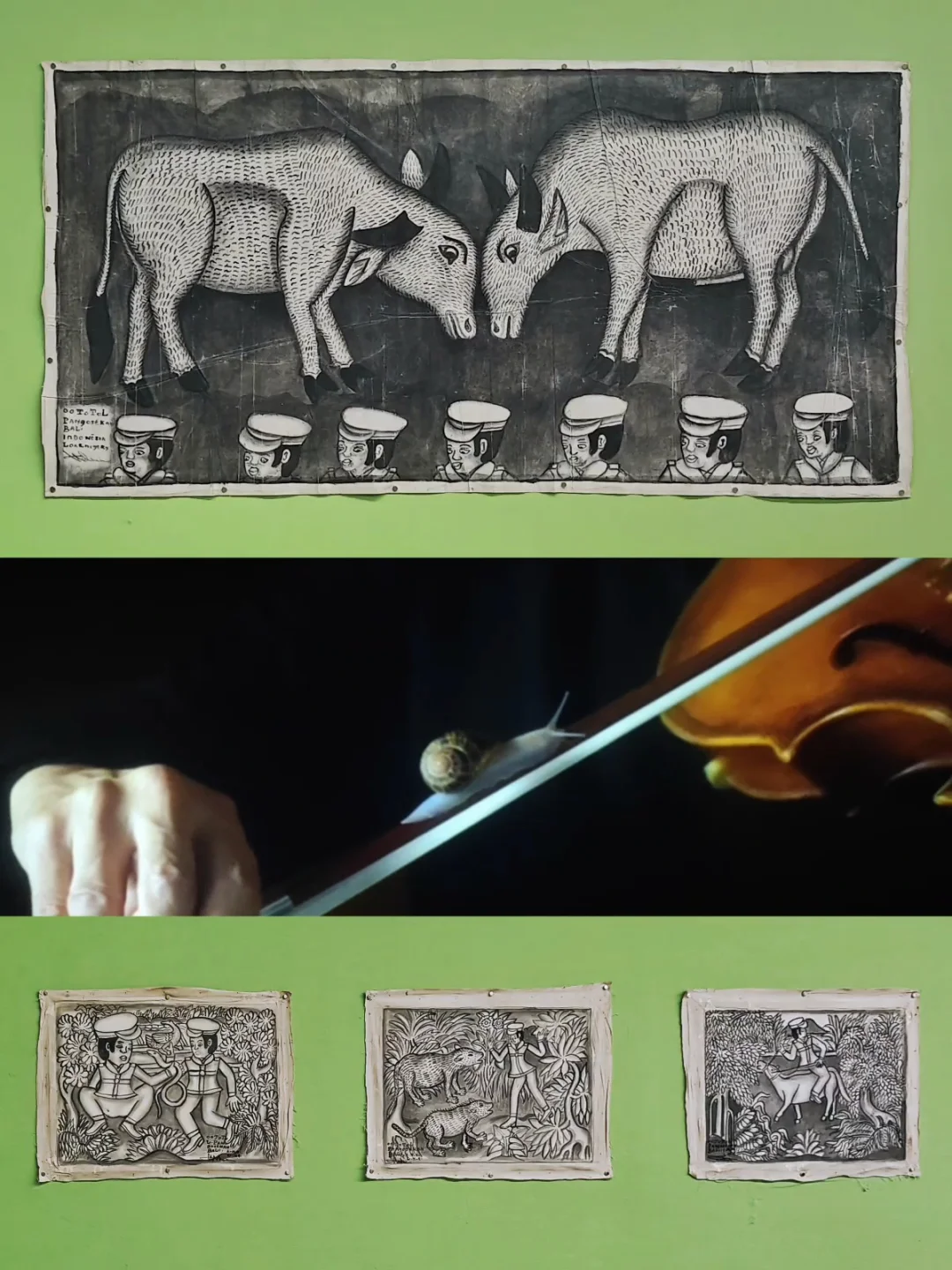 以中国墨、竹签创作,画面类似漫画分镜或印尼皮影戏,人物动态定格、表情暧昧且故事线模糊。独特的“局外人美学”,装饰边框常被突破,制造画内外互动的视觉趣味,探讨自然与日常主题。